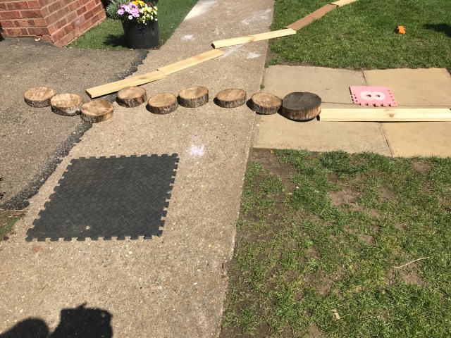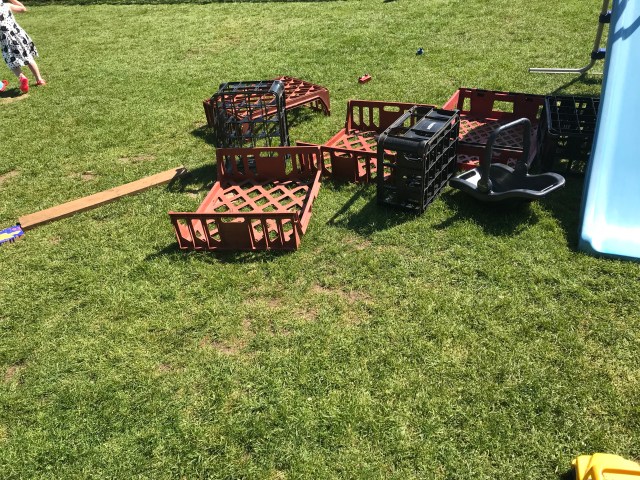 The children made a walk way and then took turns to walk along it avoiding the ‘sharks’. They built a tower to see if it could go all the up to the slide. It fell down so they rethought about how they could make it stay upright. The children worked together to build it again.