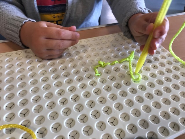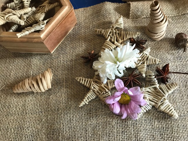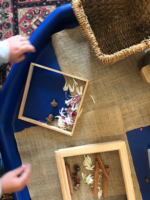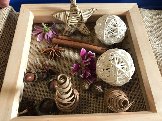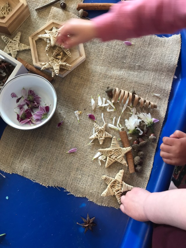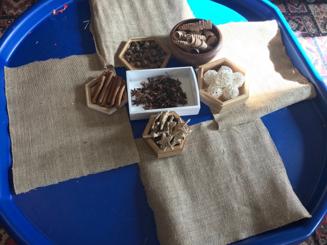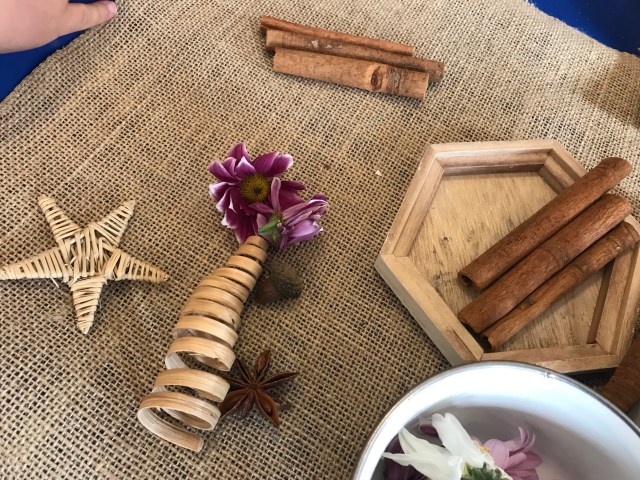 This is loose parts play. The children liked exploring the different items especially smelling the cinnamon and star anise. We had lots of talk about what they were doing and how they were using the different pieces.