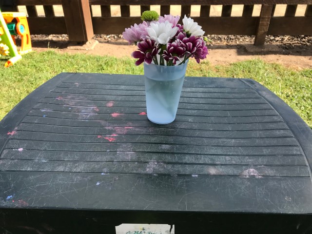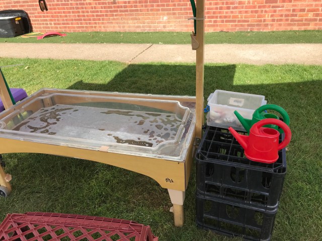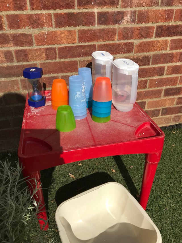 Water ready for the children to help themselves. We have it set up inside and outside.