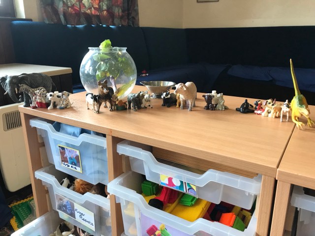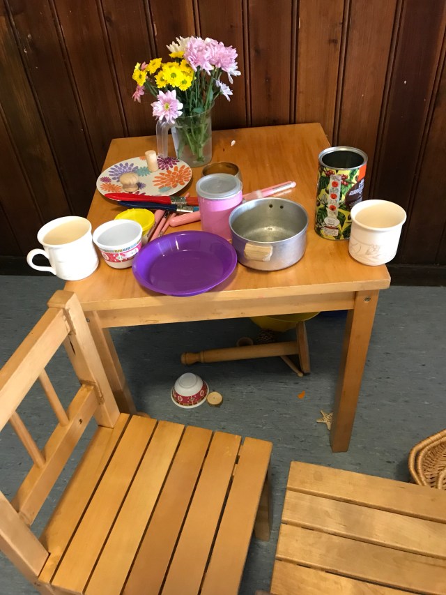 In our ‘home corner’, the children love having the flowers. They help sort them into their little vases. They are really good at taking care of them and they have not been knocked over. We also have some china cups and plates that the children are being very careful with and using fantastically in their play.