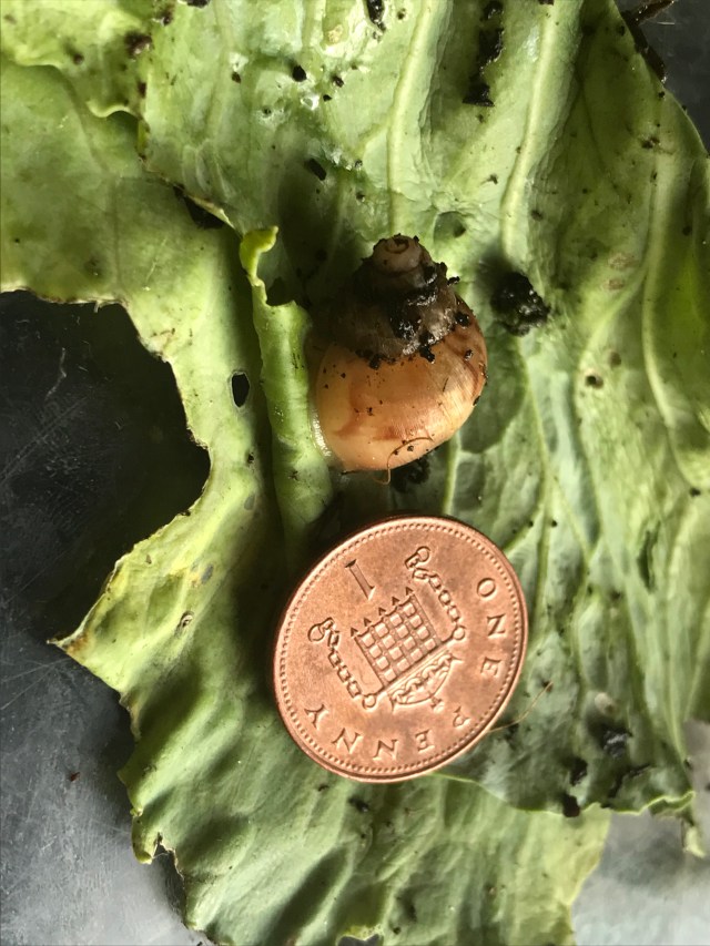 Our baby snail seems to be growing. We took a photo of him with a one pence coin.