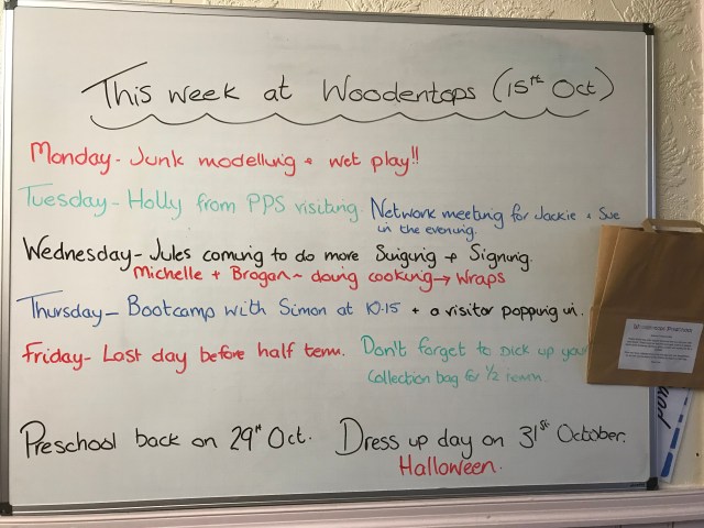 Each child hopefully had a brown bag given to them to collect things on their walks over the half term. If you didn’t get your bag, could you collect bits in a carrier bag instead? Please bring them back to preschool next week and we’ll be doing lots of fun things with them.