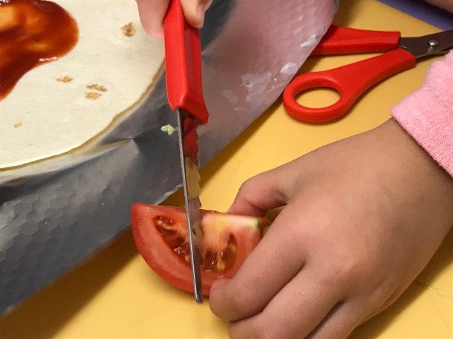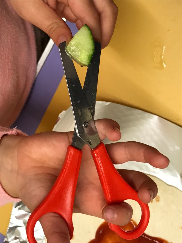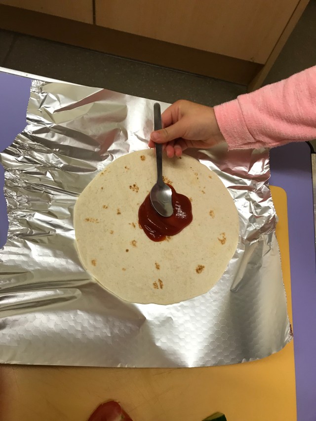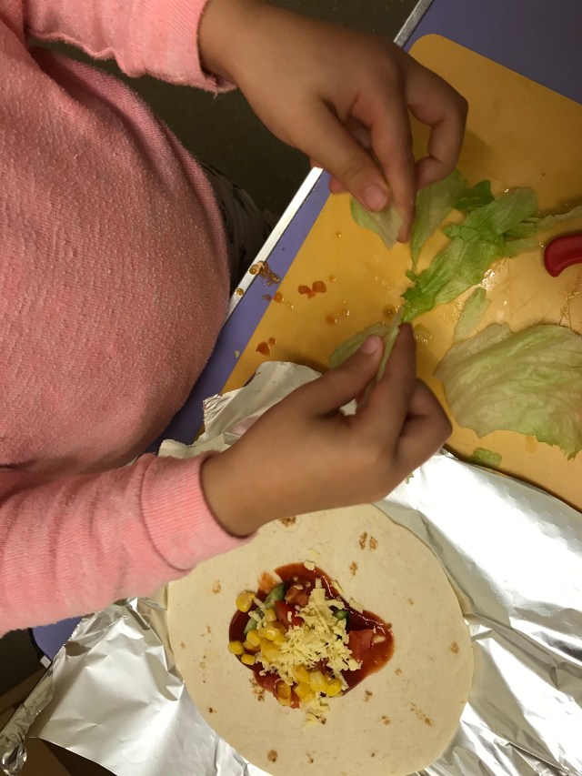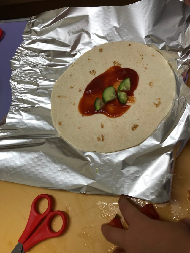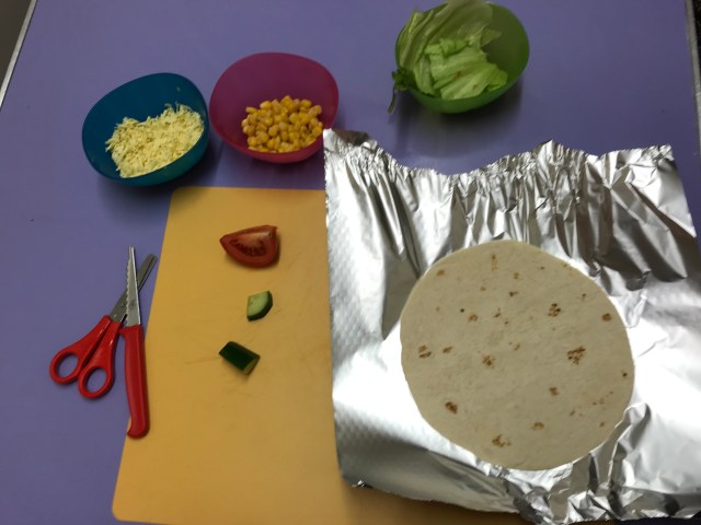 The children chose to do wraps. Vegetarian or ham. Each child had a chance to have a go, some felt they didn’t want to which is fine. Lovely that we encourage them to make their own decisions, they are all aware if they don’t make it there will be nothing to take home. The children used scissors ✂️ or a knife 🔪 to cut up their vegetables. We discovered that lettuce is really easy to rip up. Once they’d put what they wanted in their wrap, they rolled it up, then wrapped it in the foil and put it in the fridge.