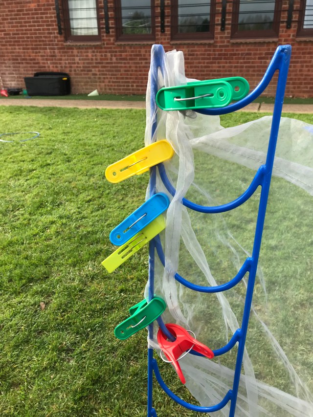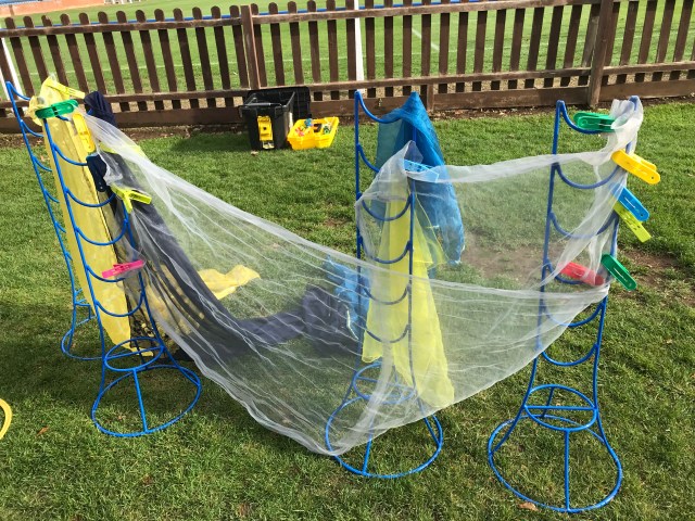 One little 2’s idea of a den. She spent ages choosing the material and pegging it to the stands. As she worked she chatted about what went where. If she needed help she asked the adult to hold the material whilst she pegged it.