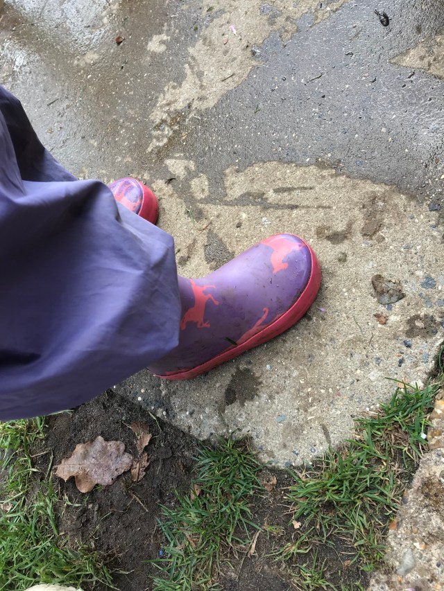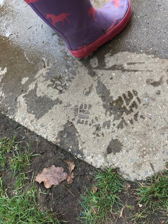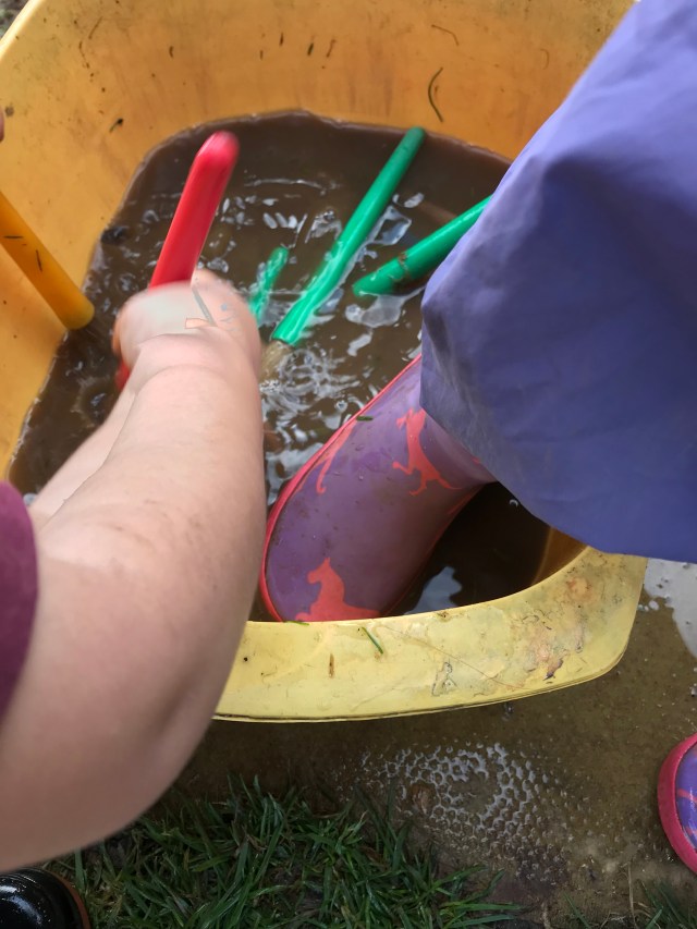 Using the water to make footprints whilst her friends painted the path with water. Lots of talk about how many, the size of the print and when others joined including adults, how much bigger or smaller they were.