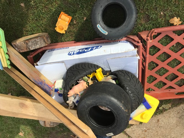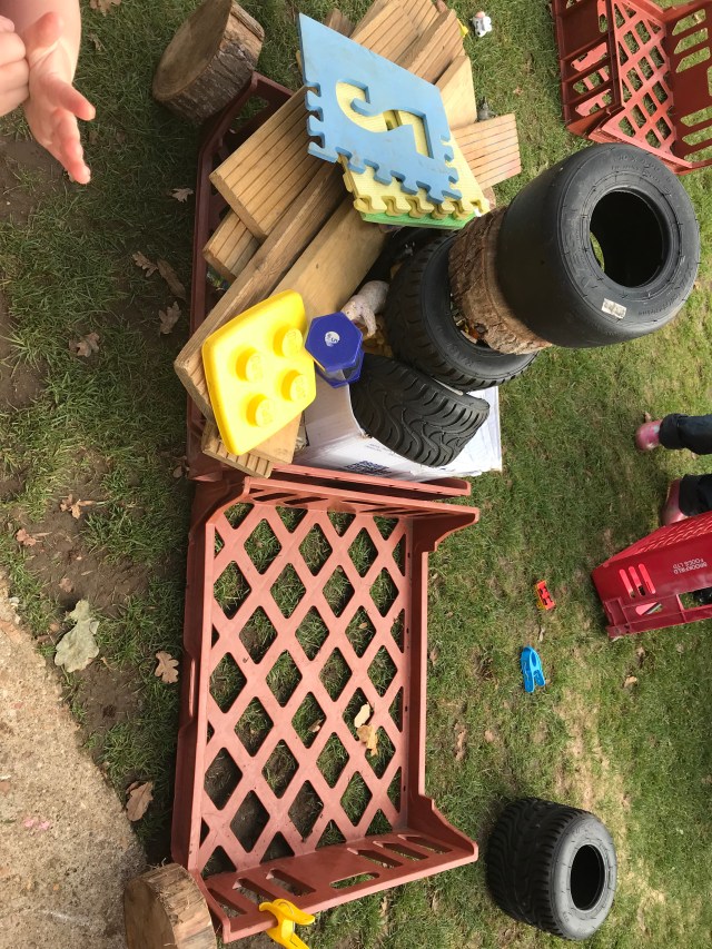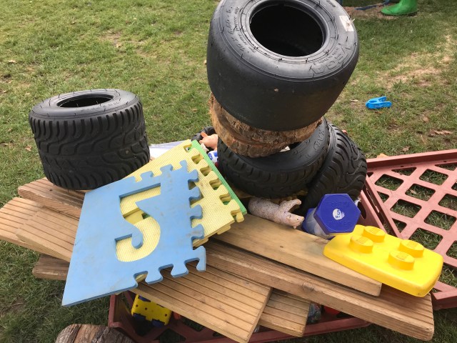 One little one, having built a camp fire last week went on to do a fire engine this week. He was supported by 5 friends who discussed about how and where everything went. They made sure there was space at the front for 2 to ‘drive the engine ‘ using a wood cookie as the steering wheel. Planks of wood became hoses and the milk crates were stacked to become a ladder which they took in turns to climb, use the ‘hose’ to put out the fire 🔥 and jump down from the ladder. They encouraged each other especially when one was a little unsure of climbing 3 crates by reducing it to 2 and helping him climb up. Once he mastered it, another was added and he jumped from it just like his friends.