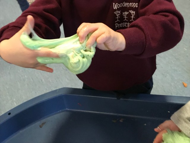 We made slime this week. The children enjoyed the feel of it, lots of descriptive words used such as slimy, cold, stretchy, sticky used.