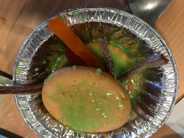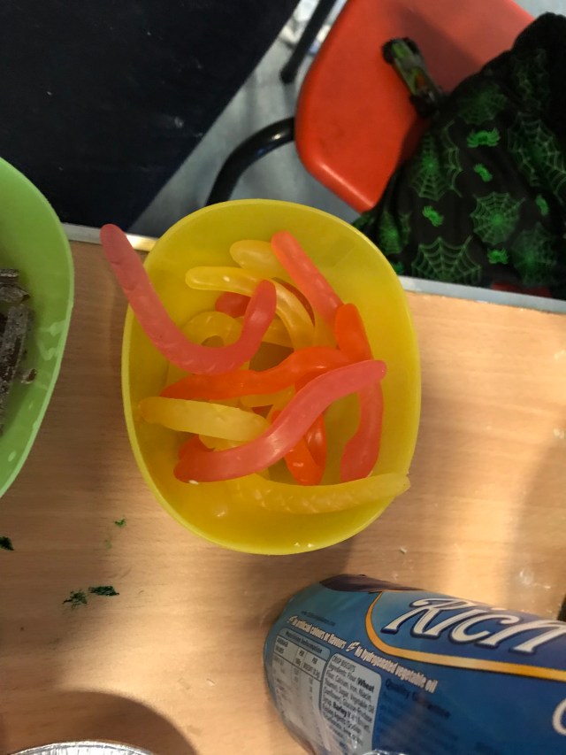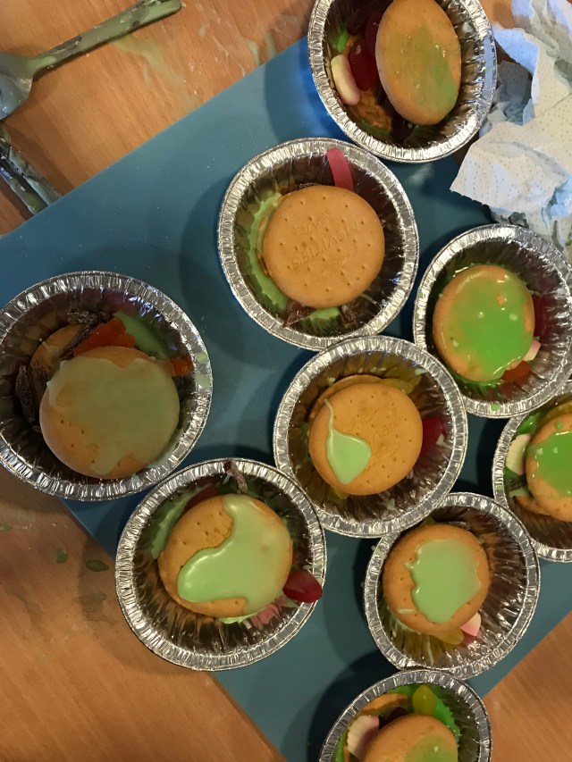 Spider sandwiches chosen by the children after reading the book. Fun on Halloween where the children dressed up and played with cauldrons made from pumpkins.