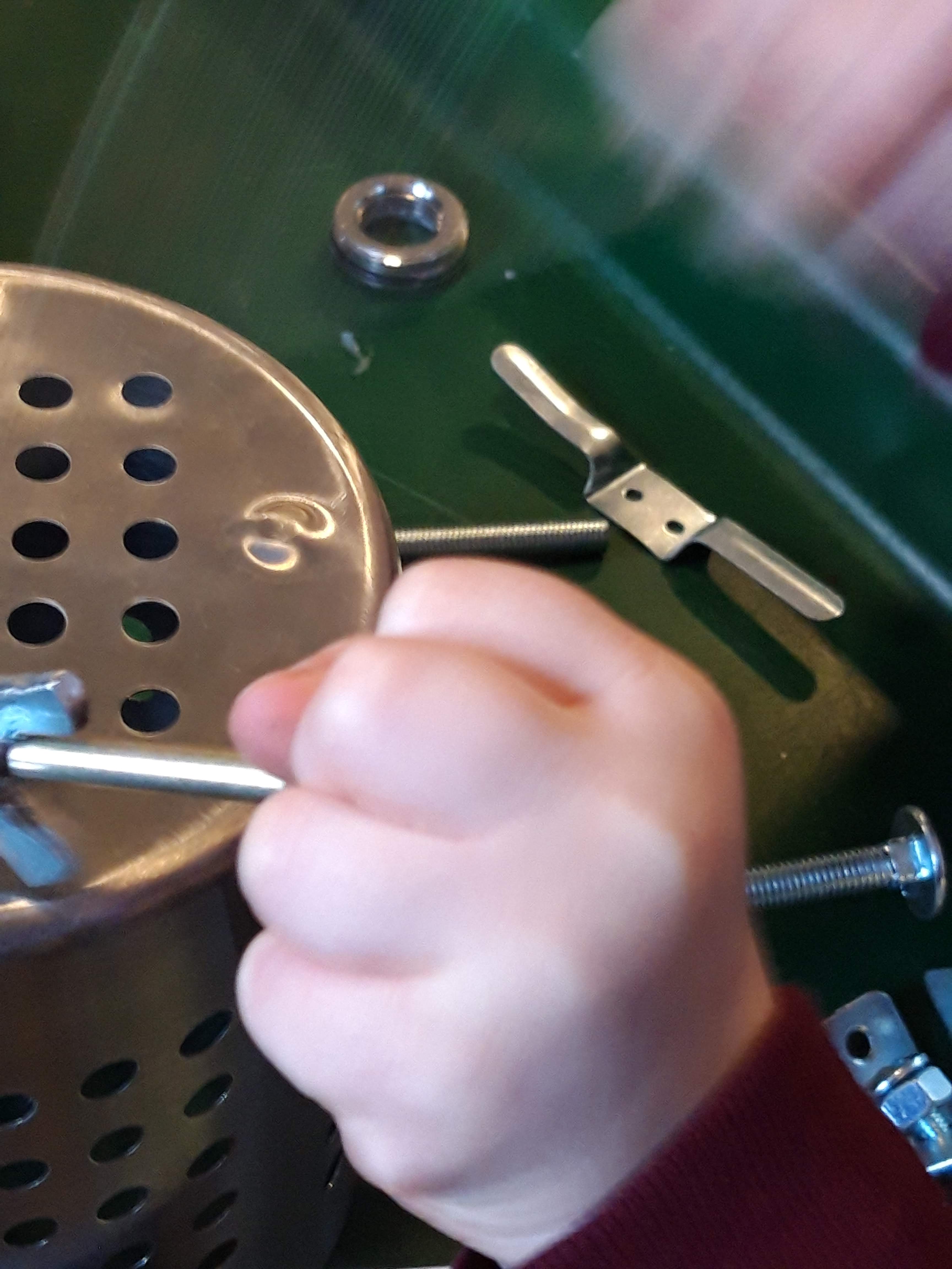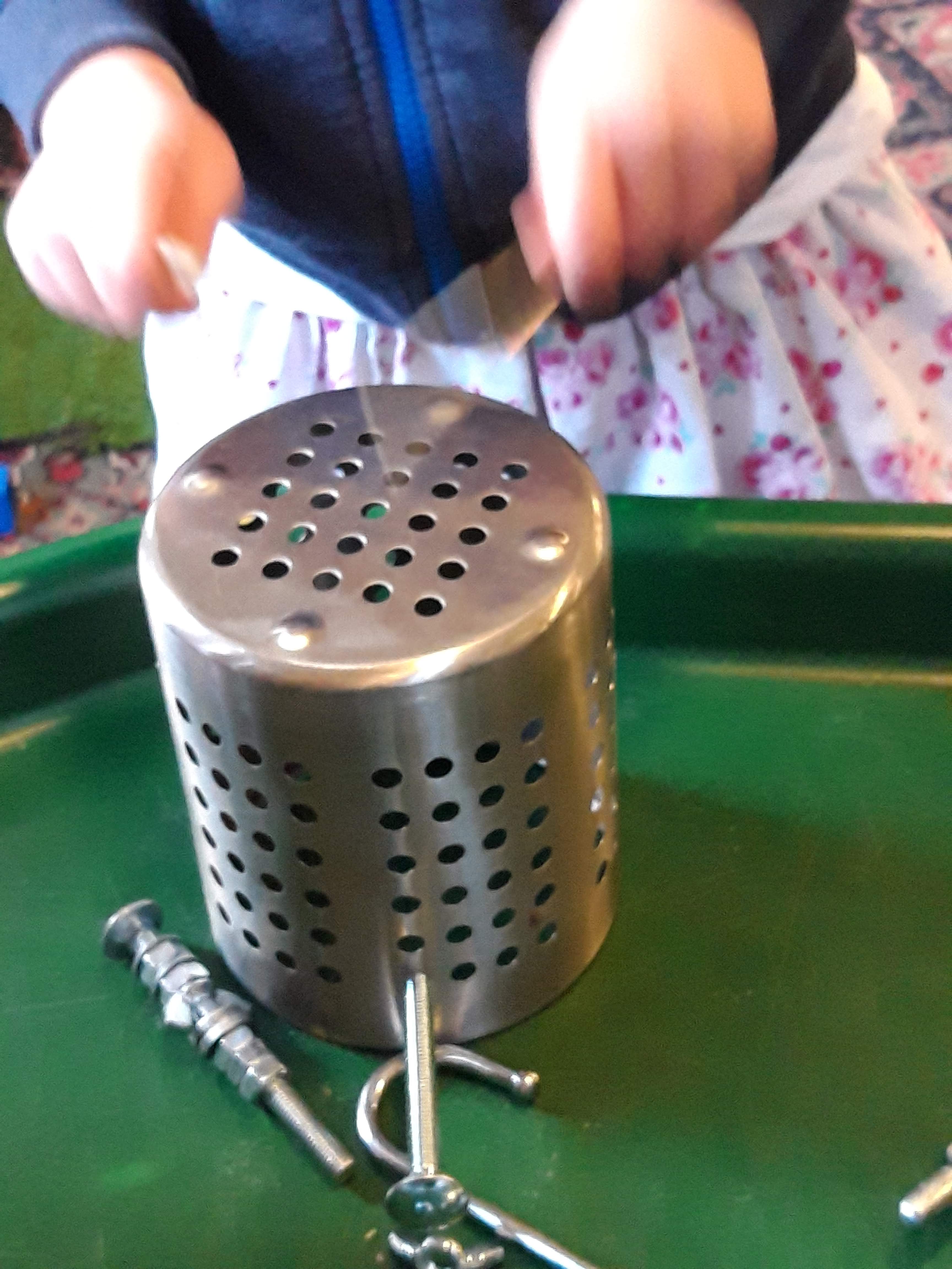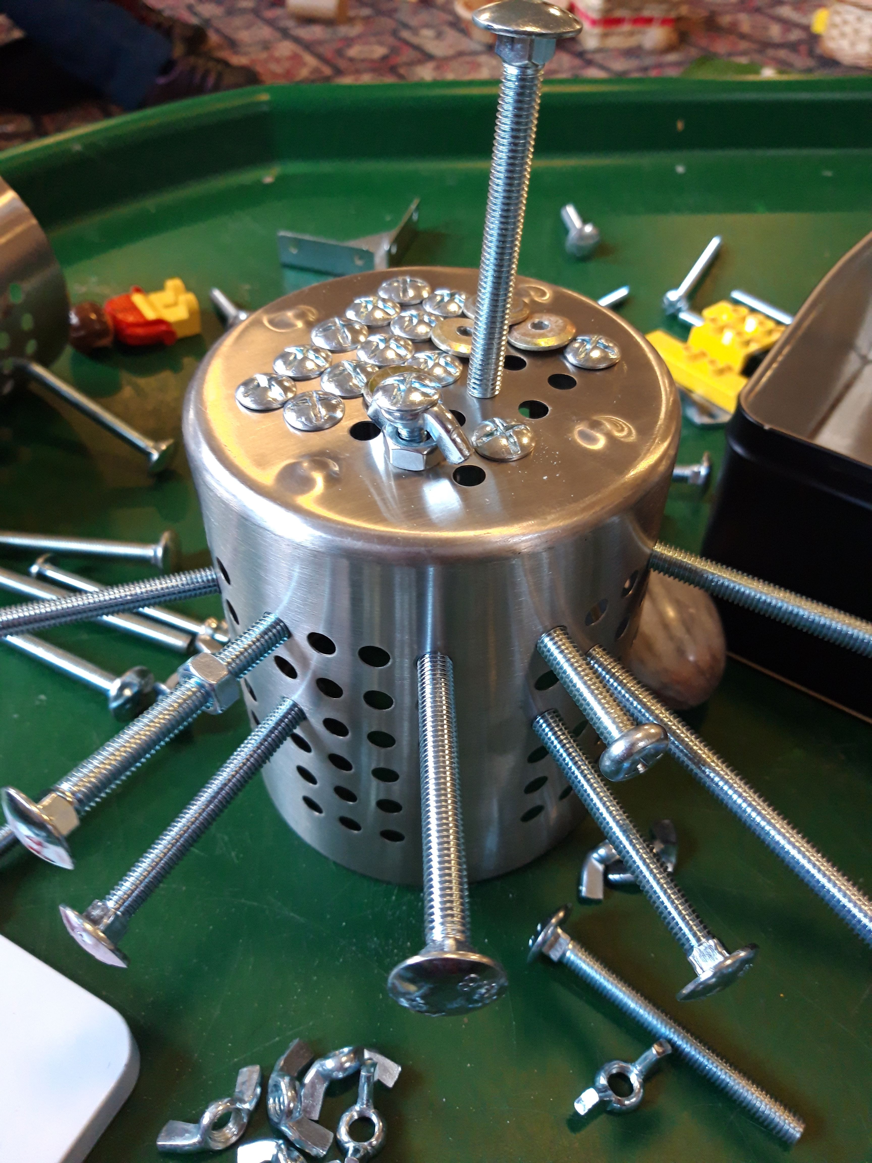 Working with nuts and bolts. The children really enjoy twisting and turning the nuts and bolts into the colander. They used the loose parts to make patterns and pictures based on their ideas. They were also used as a drum. There was lots of talk about what the bolts felt like- whether they were heavy, light, cold, ridged etc.