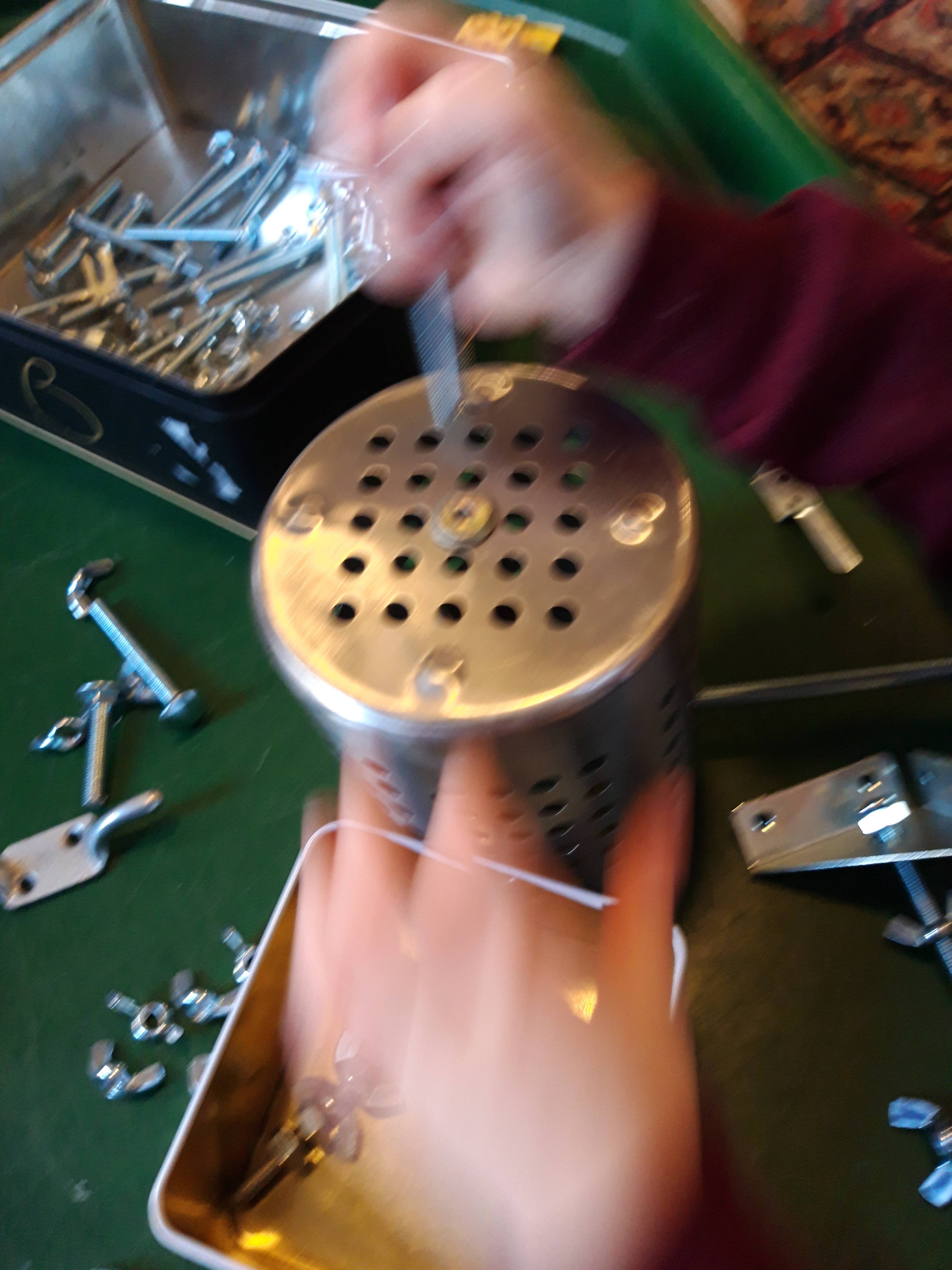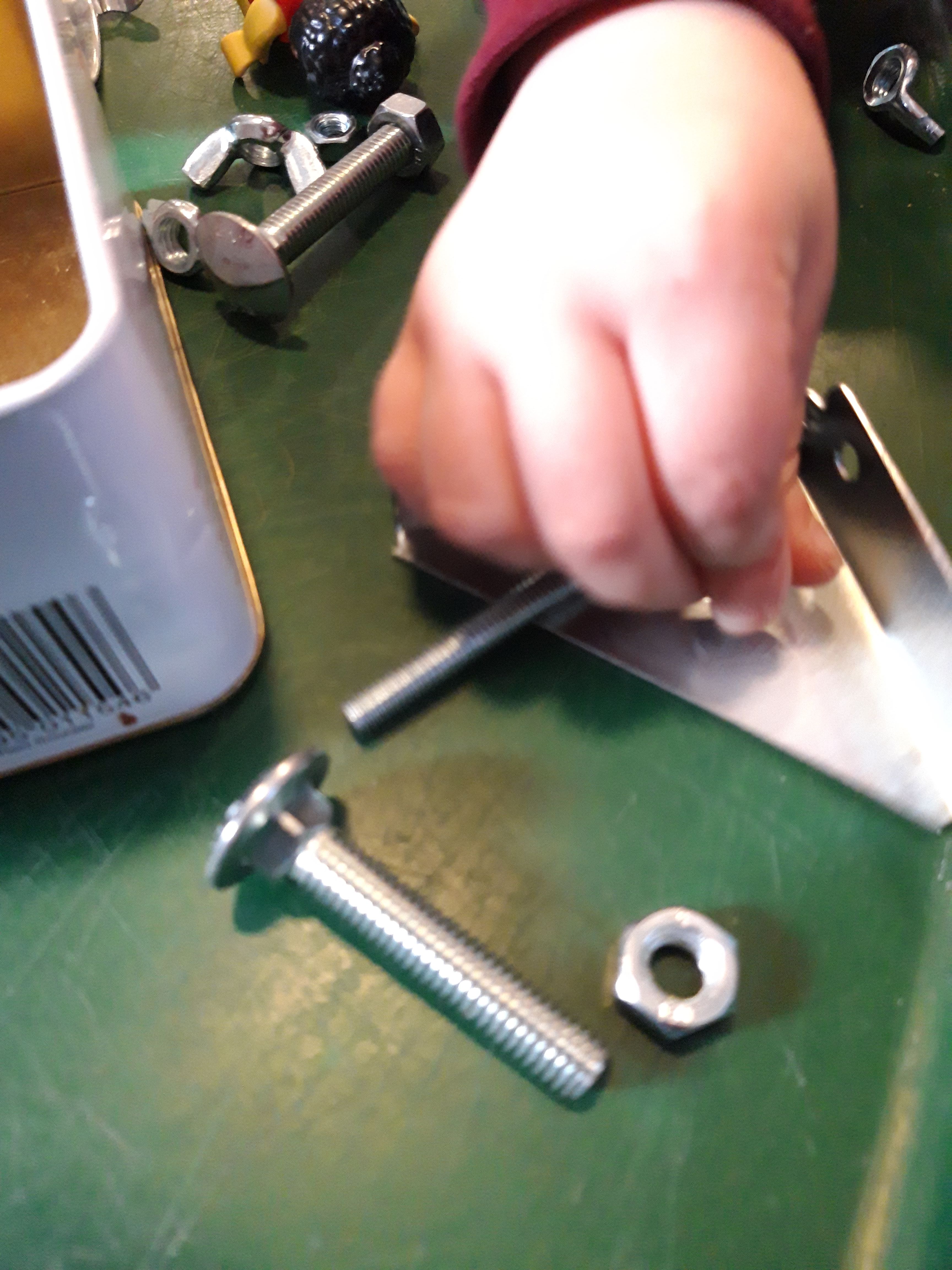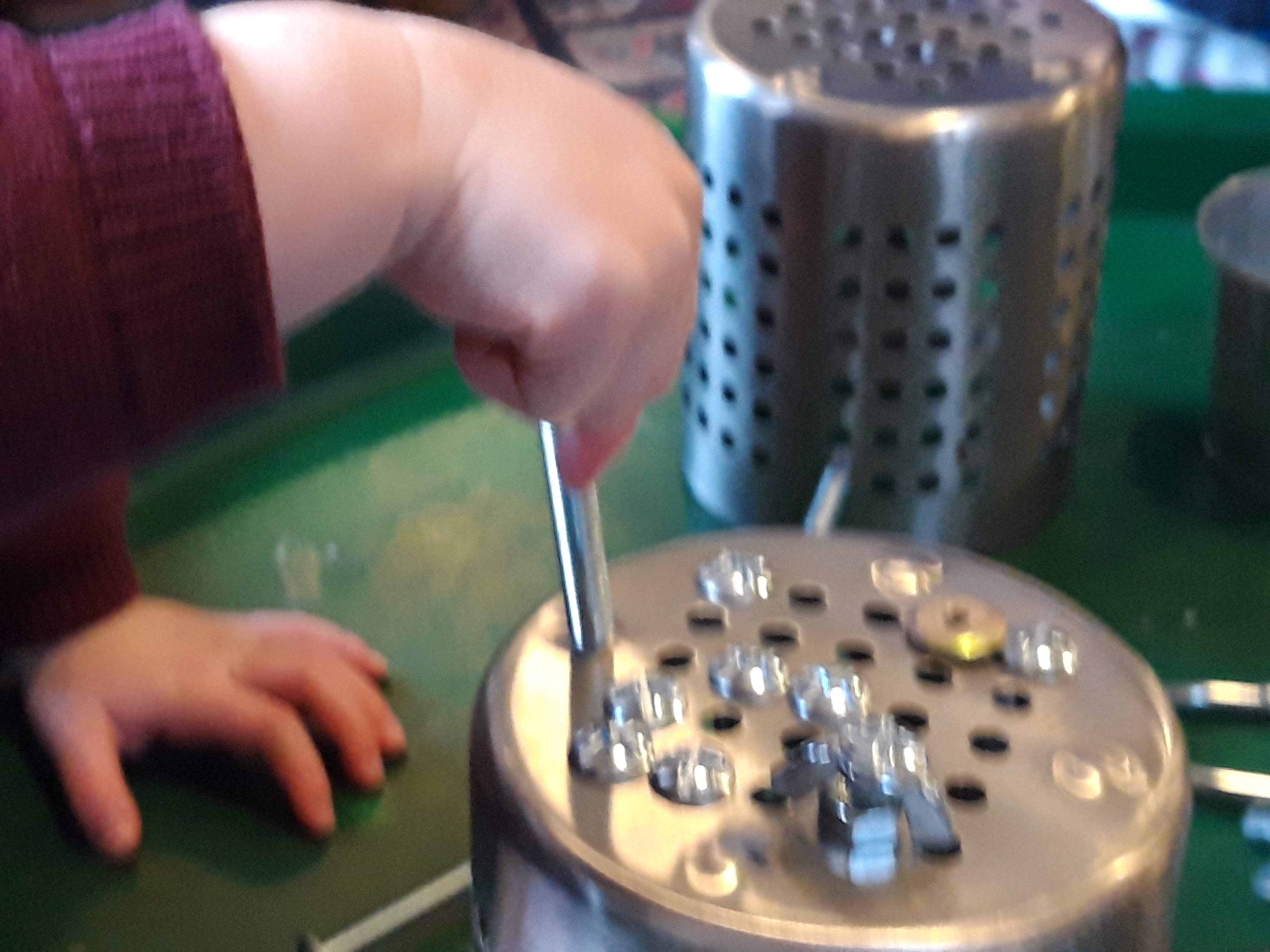 Working with nuts and bolts. The children really enjoy twisting and turning the nuts and bolts into the colander. They used the loose parts to make patterns and pictures based on their ideas. They were also used as a drum. There was lots of talk about what the bolts felt like- whether they were heavy, light, cold, ridged etc.