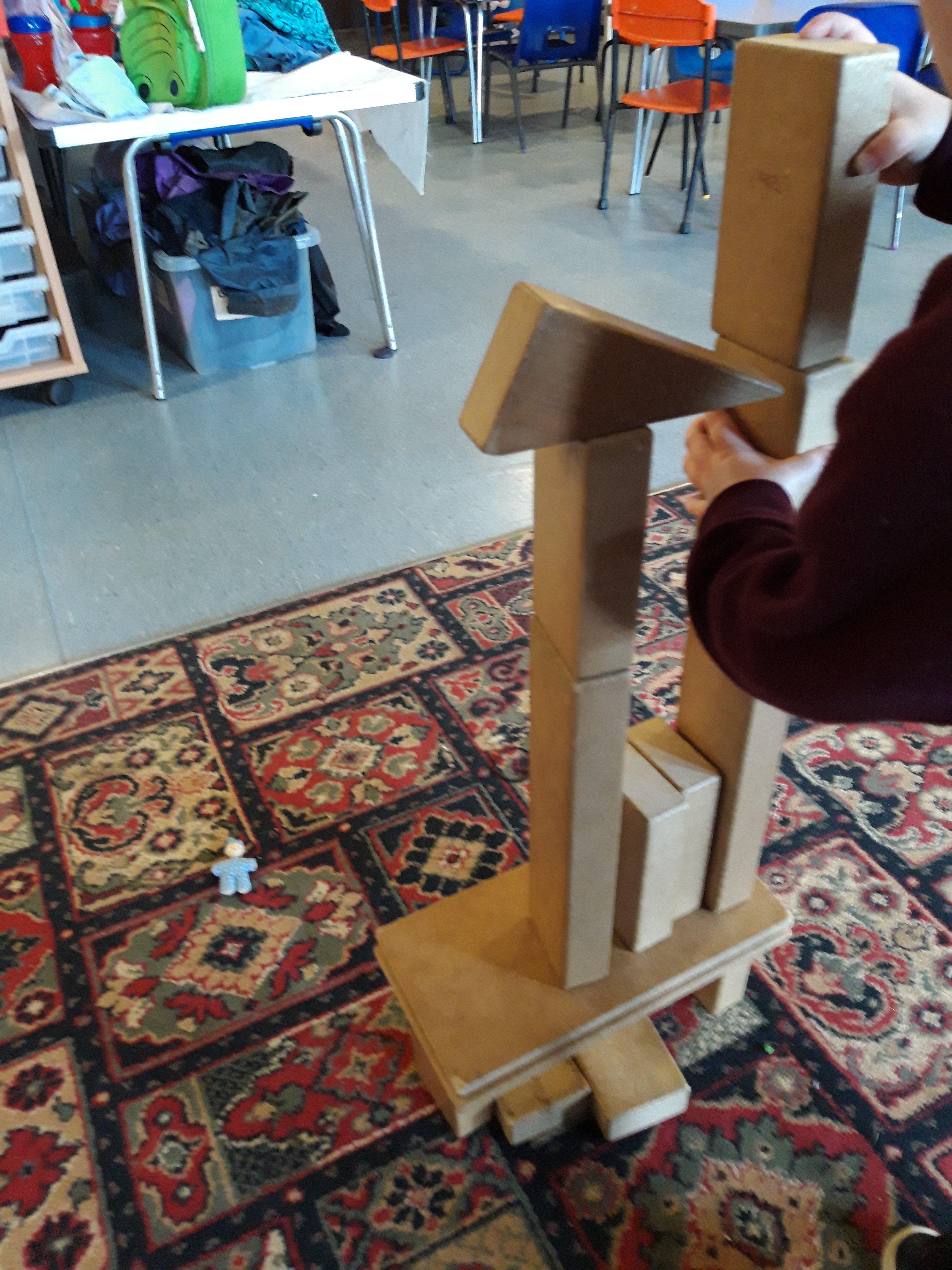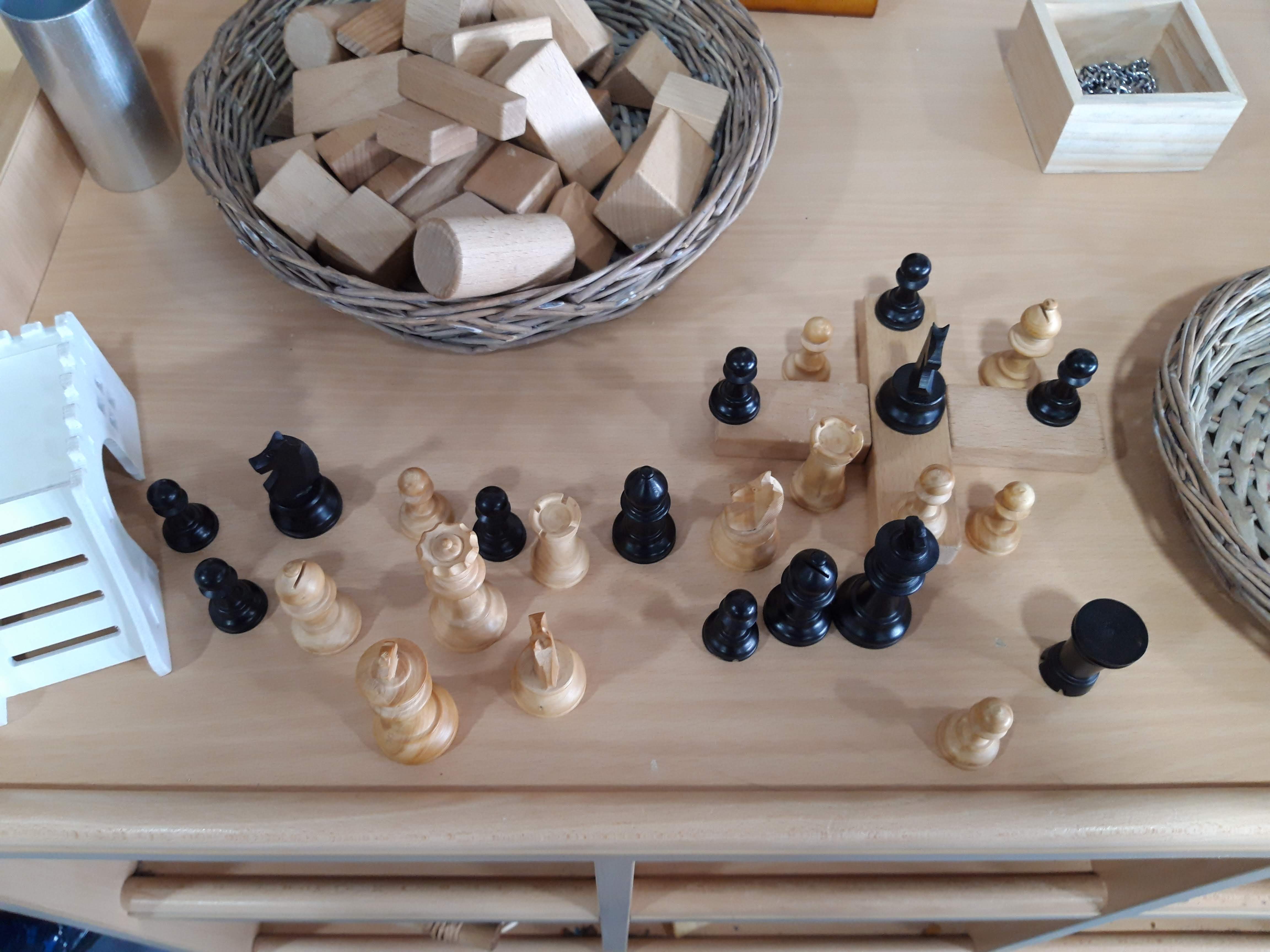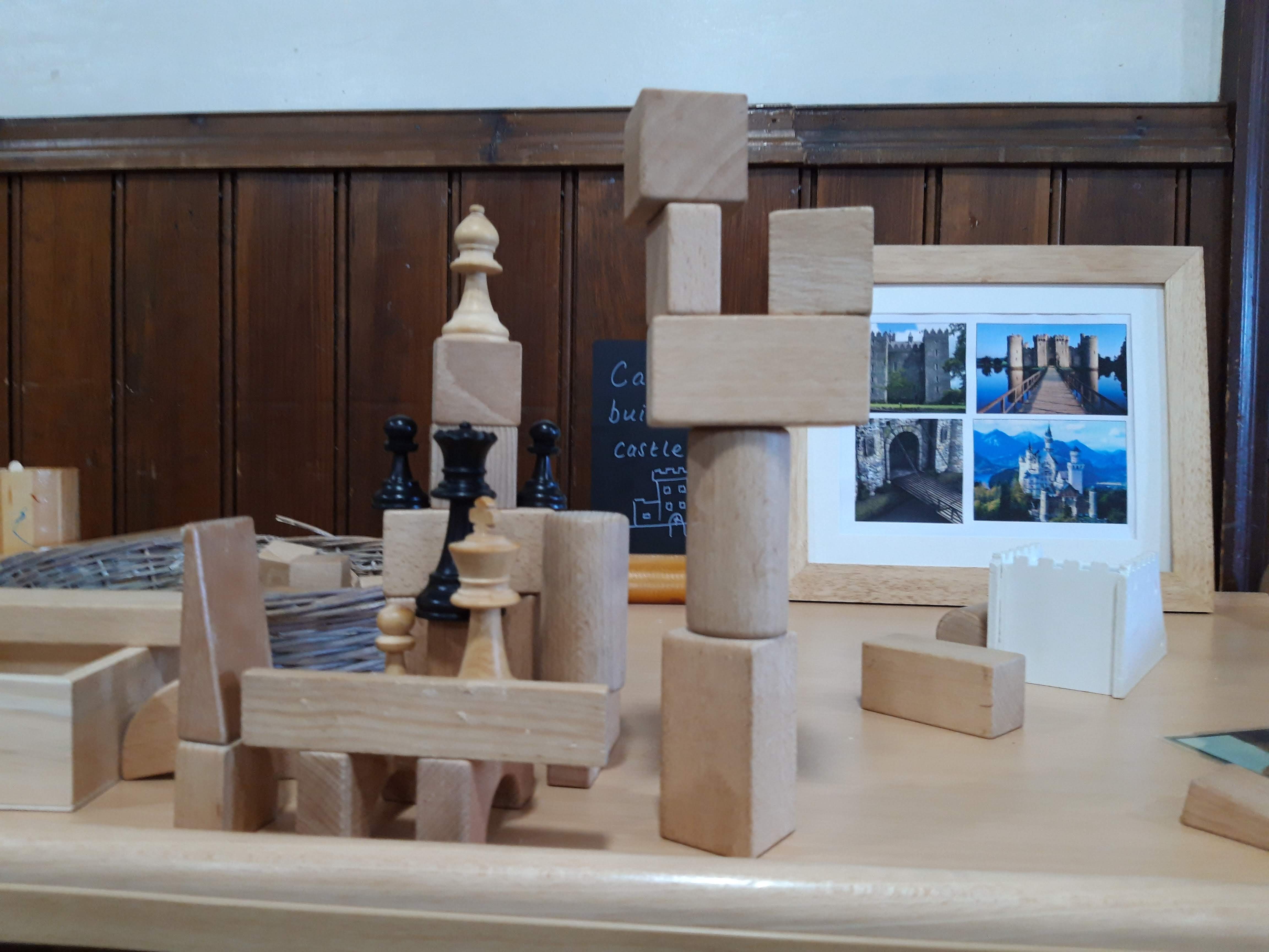 We added wooden chess pieces to the display and the children lined them up and added them to their buildings.