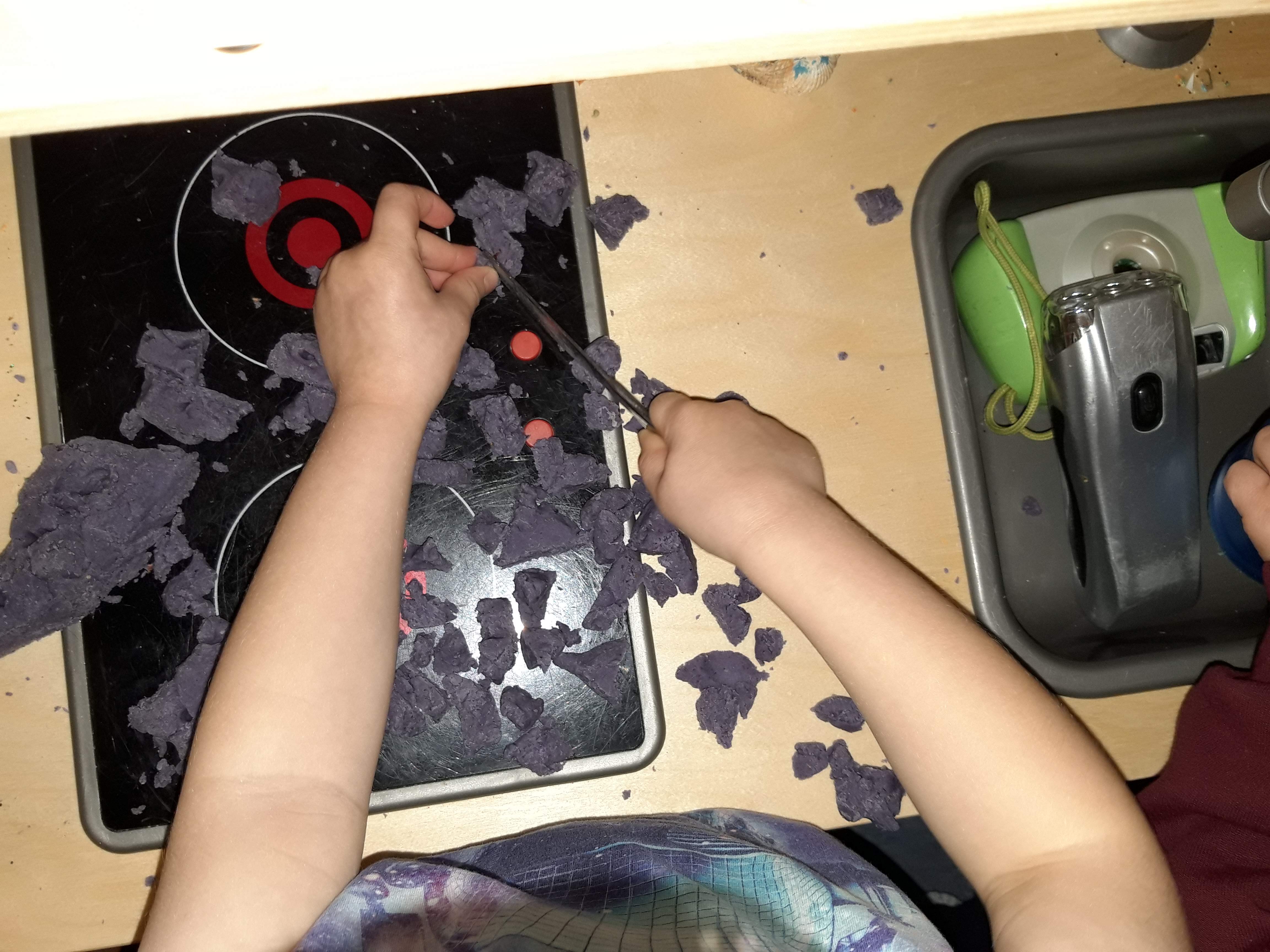 The children use metal cutlery to play with in our kitchen area. This child has great pincer control over the knife and playdoh, super practice for when he starts to write.