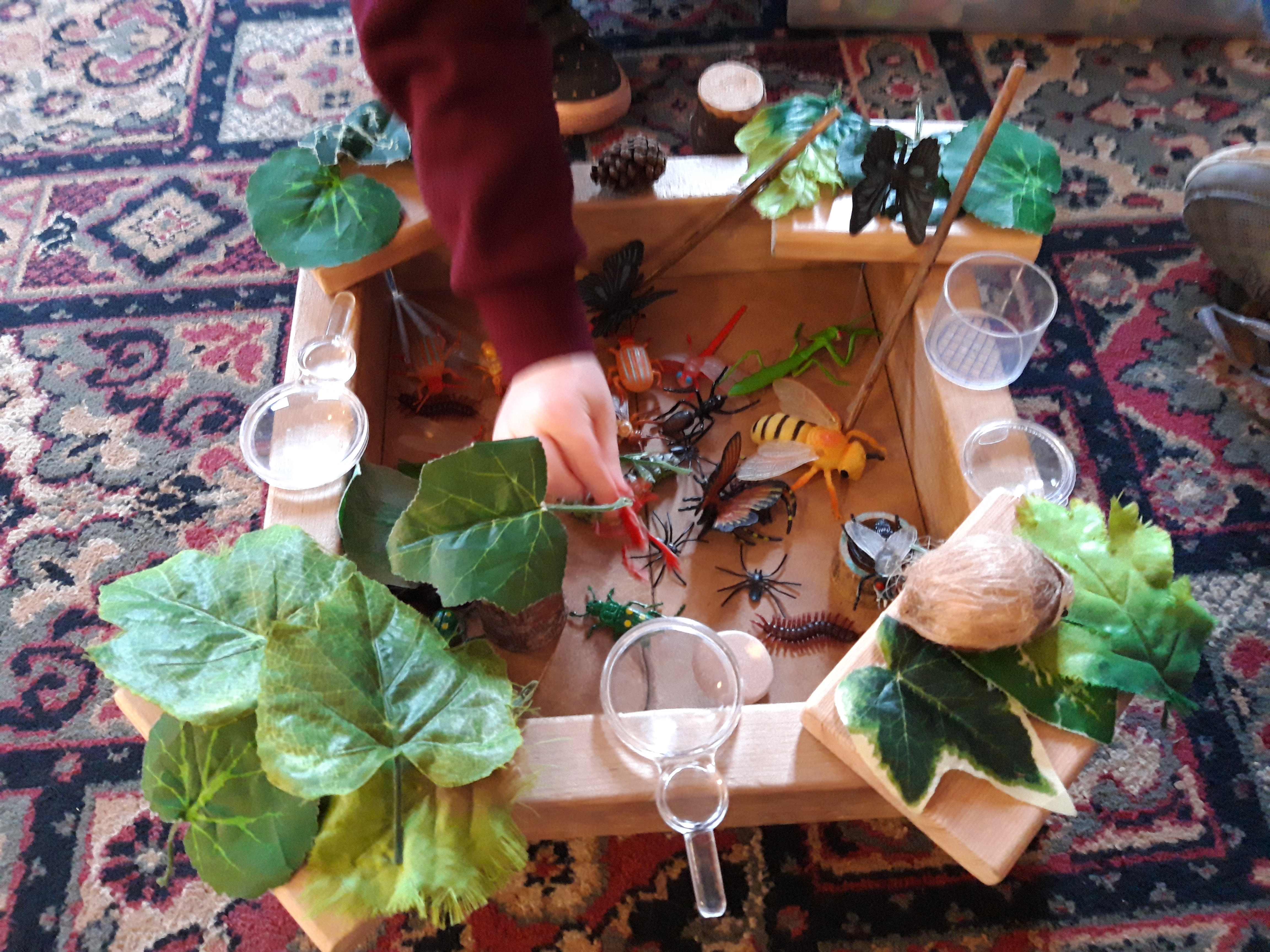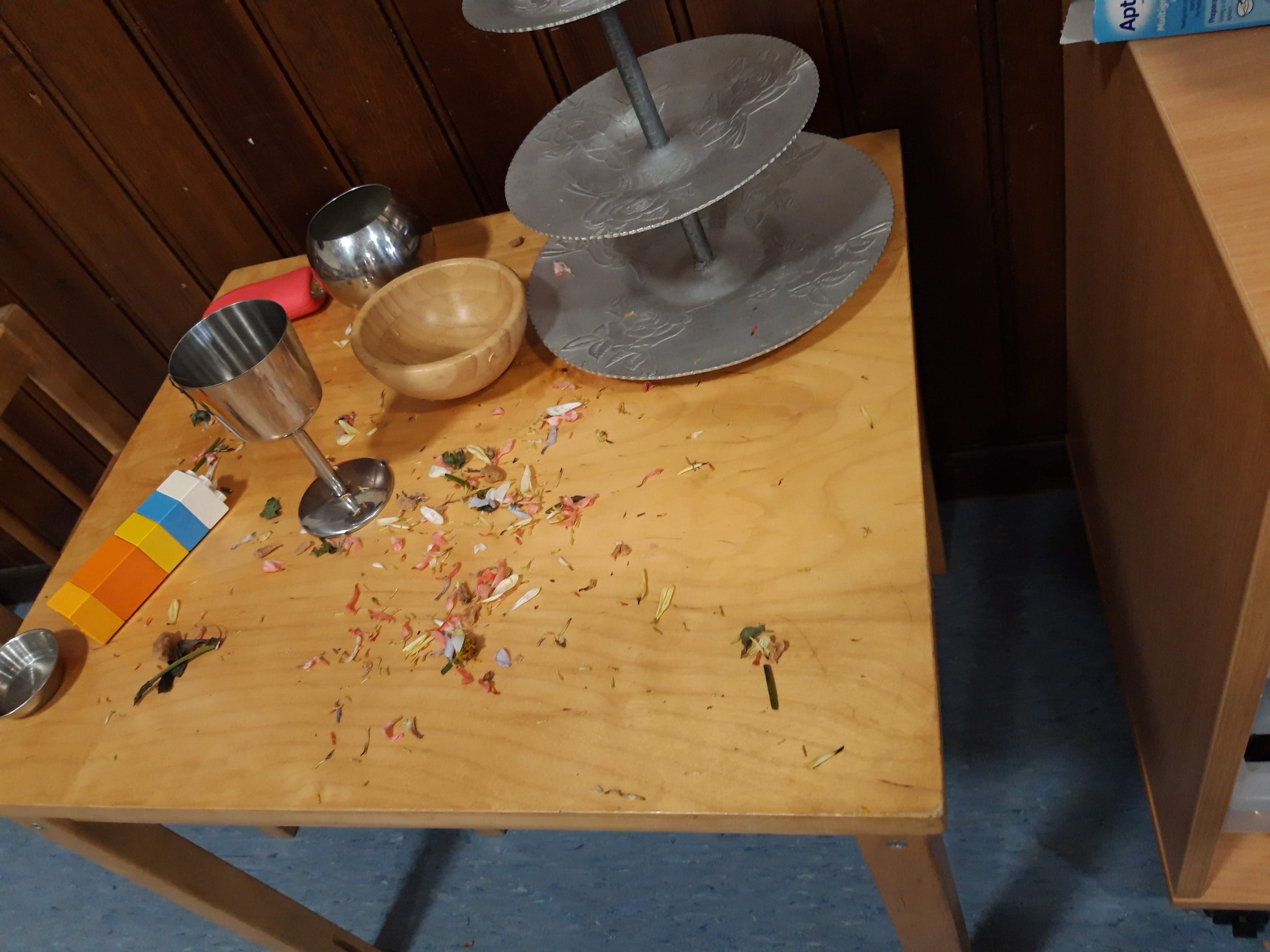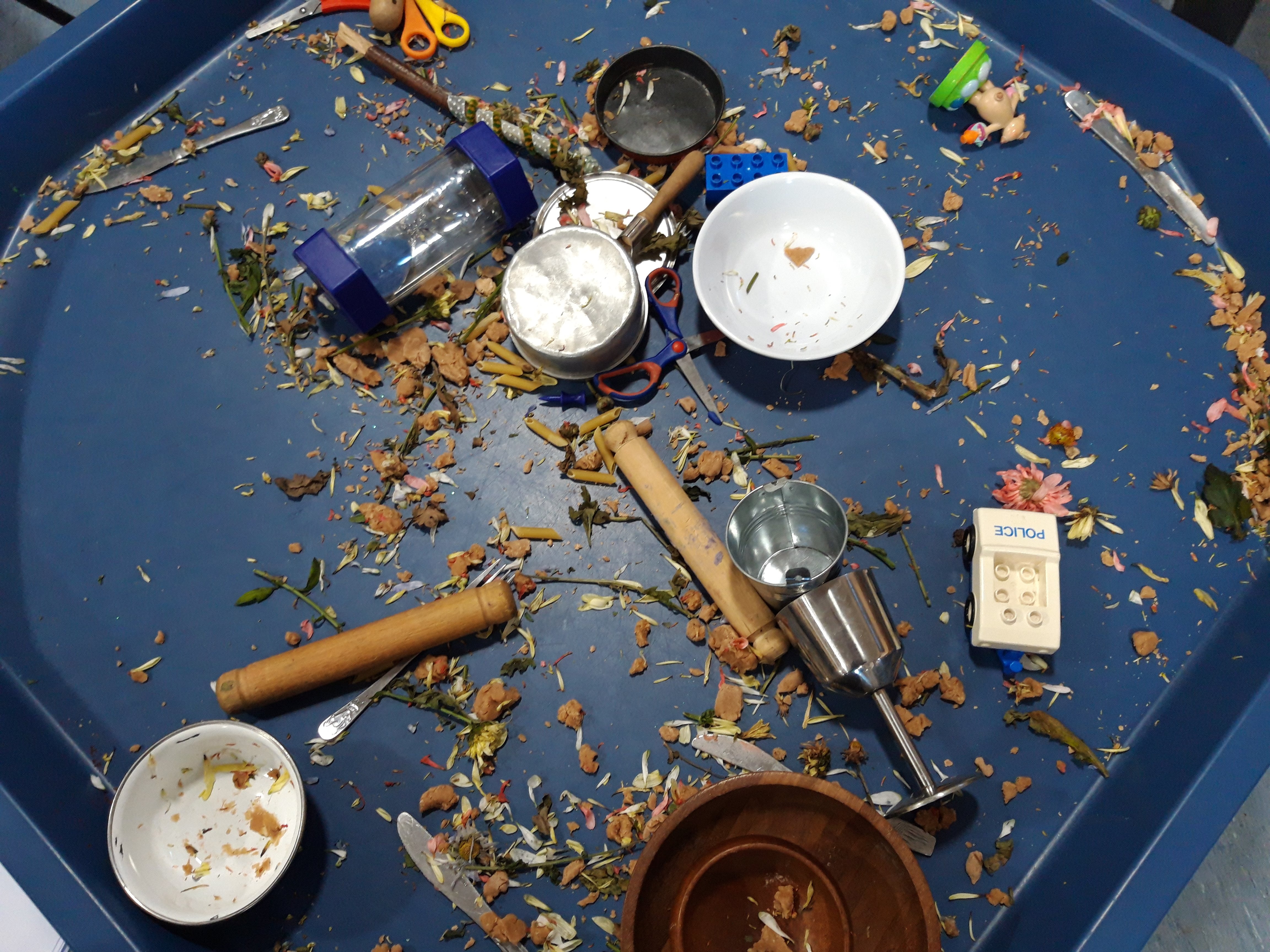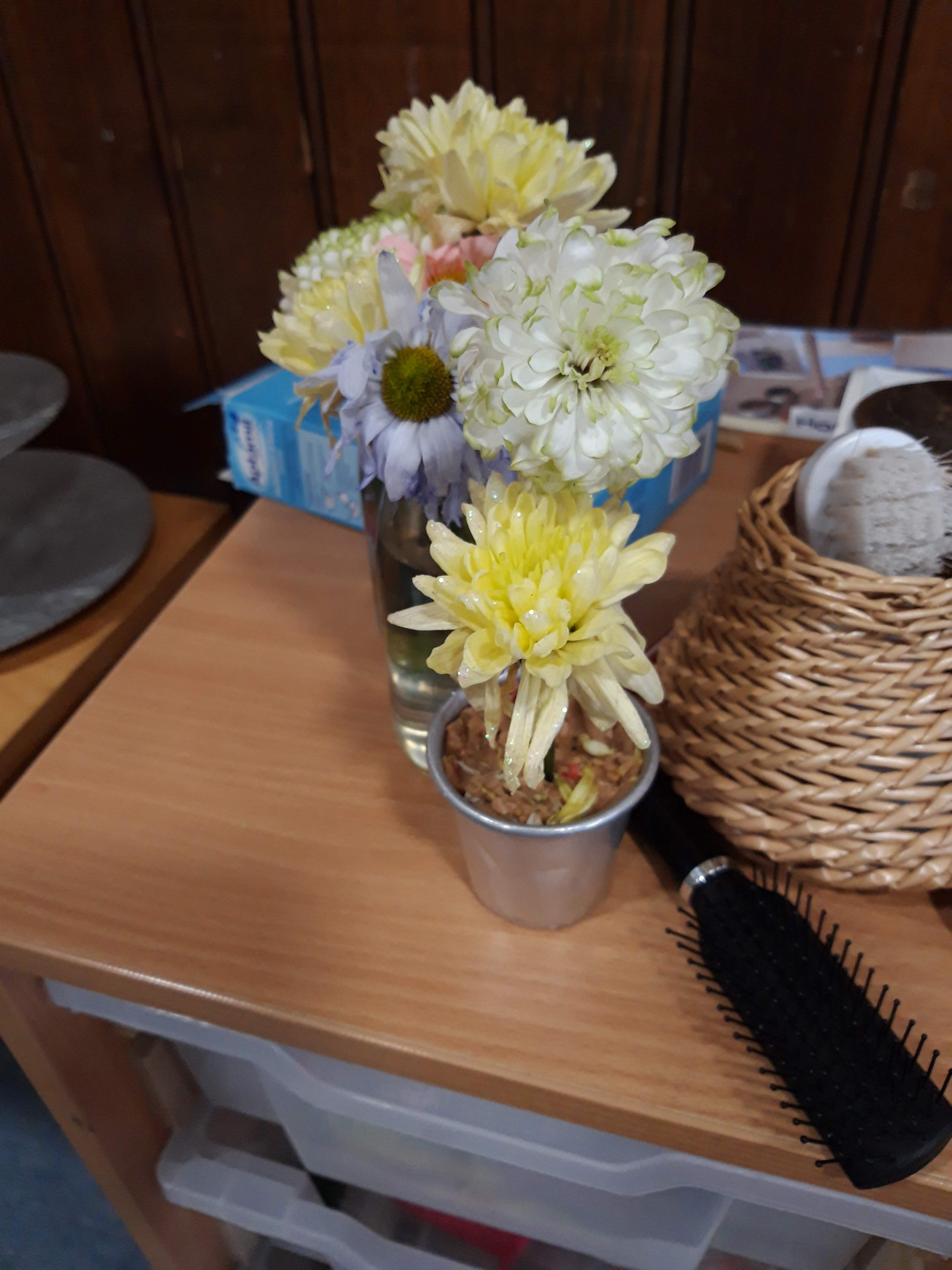 We love having flowers in, the children prepare them for their little vases, any left overs or ones that were damaged are used in their loose play and often become ‘food’.