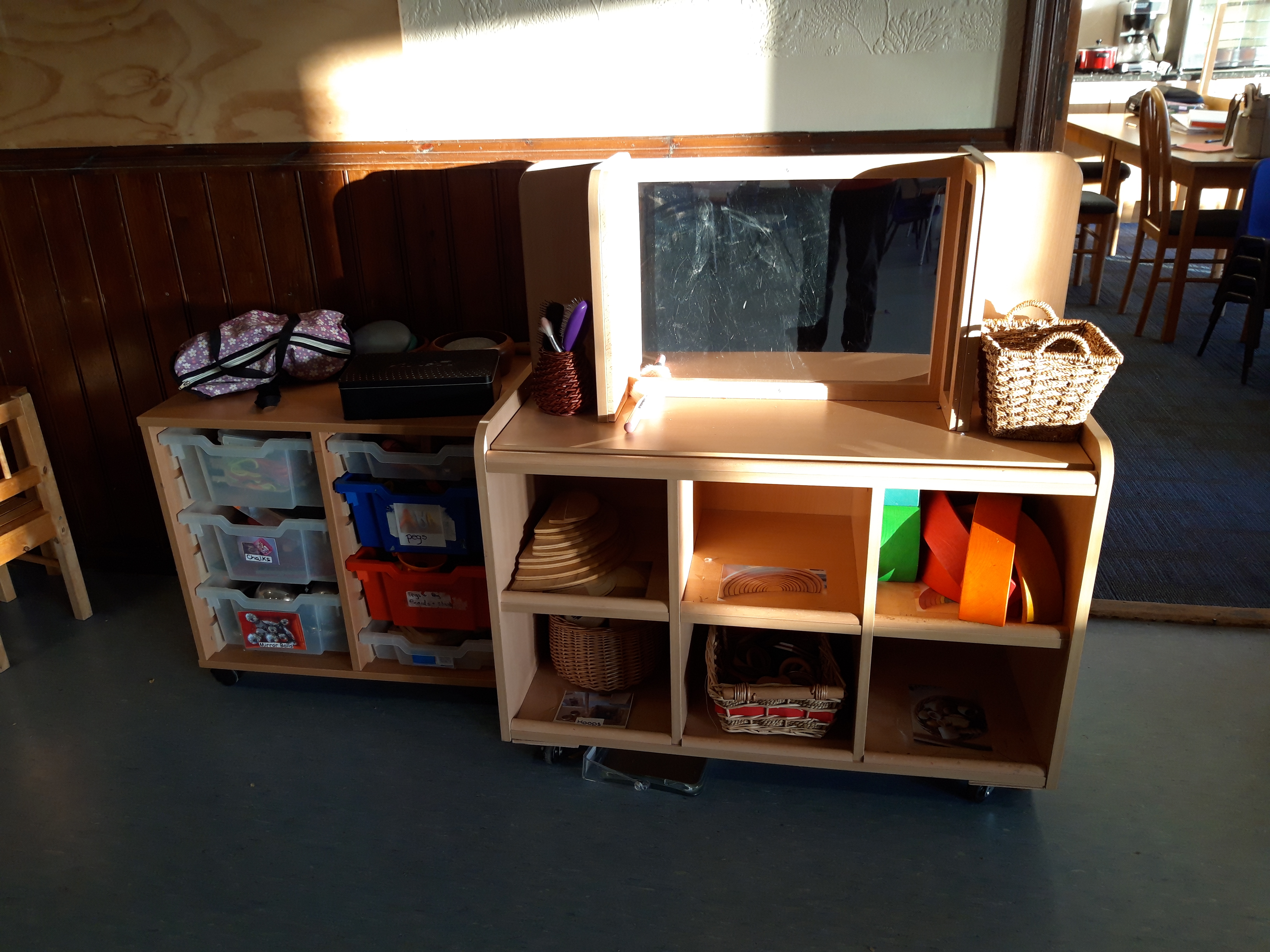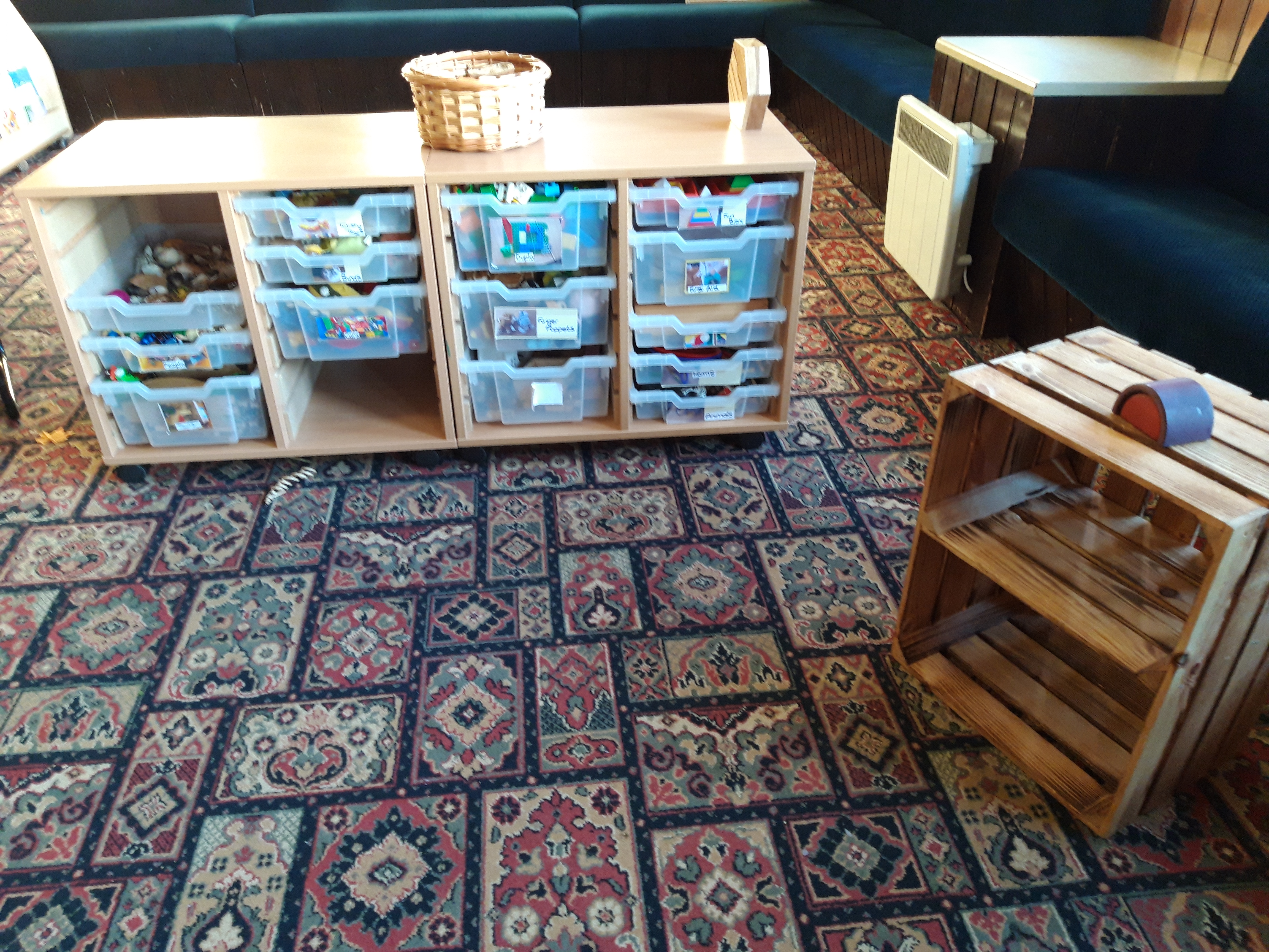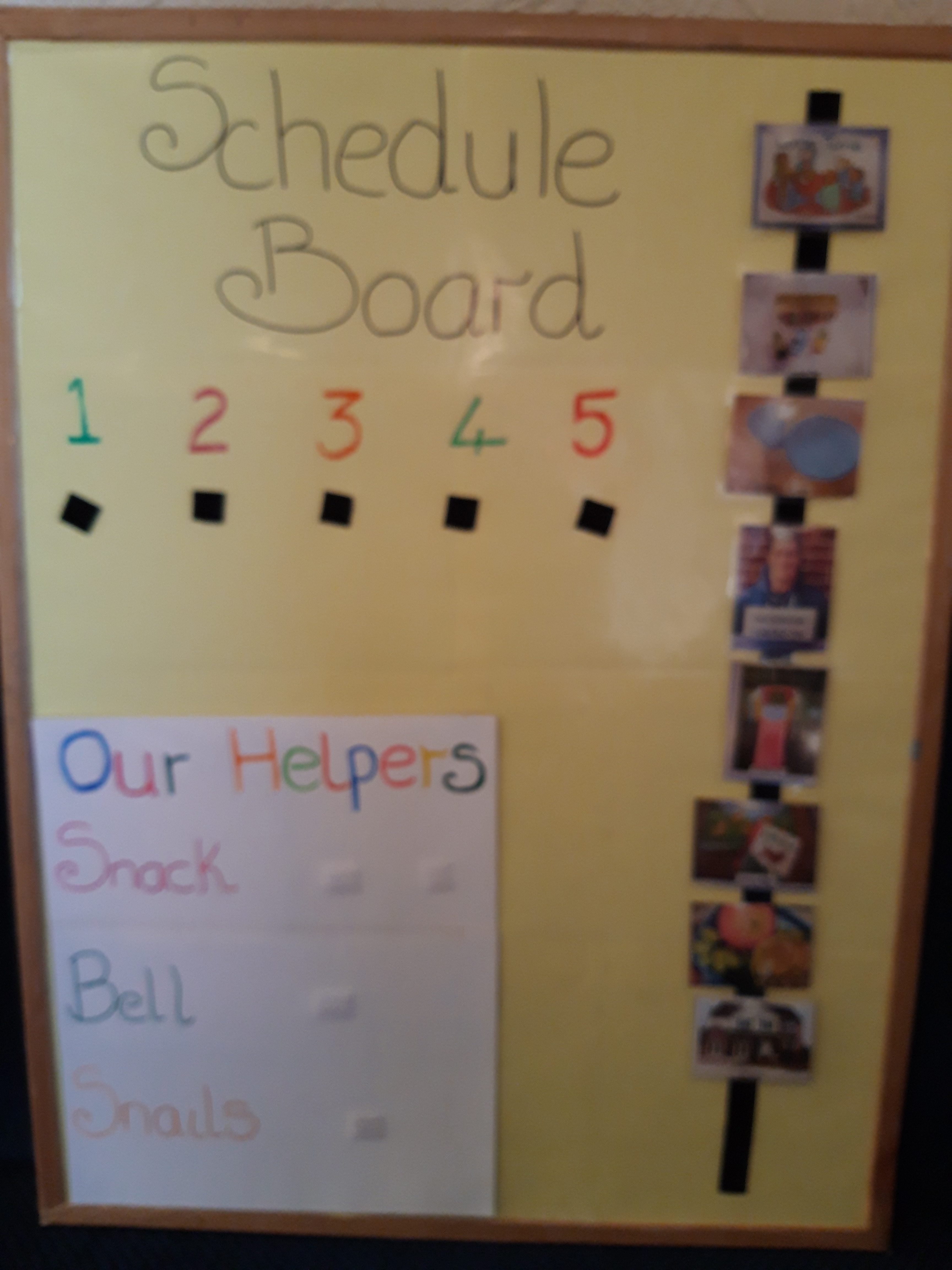 The room already set up for our children to come and play. We have the schedule board out ready so children can see what is going to happen through out the morning. When the activity takes place, it is taken off the board so the children can see how close snack, lunch or home time is. It really helps those that are a little anxious about routine. The little tables covered in white are for the children to put their names on so they can put any products they make- pictures, models etc; on to take home. This helps reinforce how their name looks and encourages them to recognise their name.