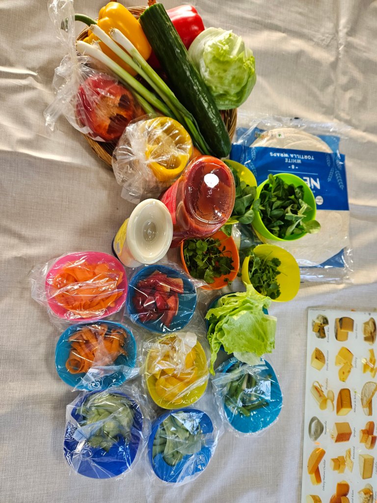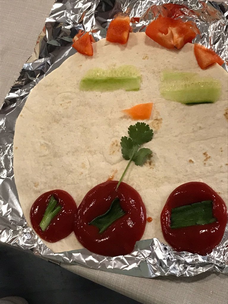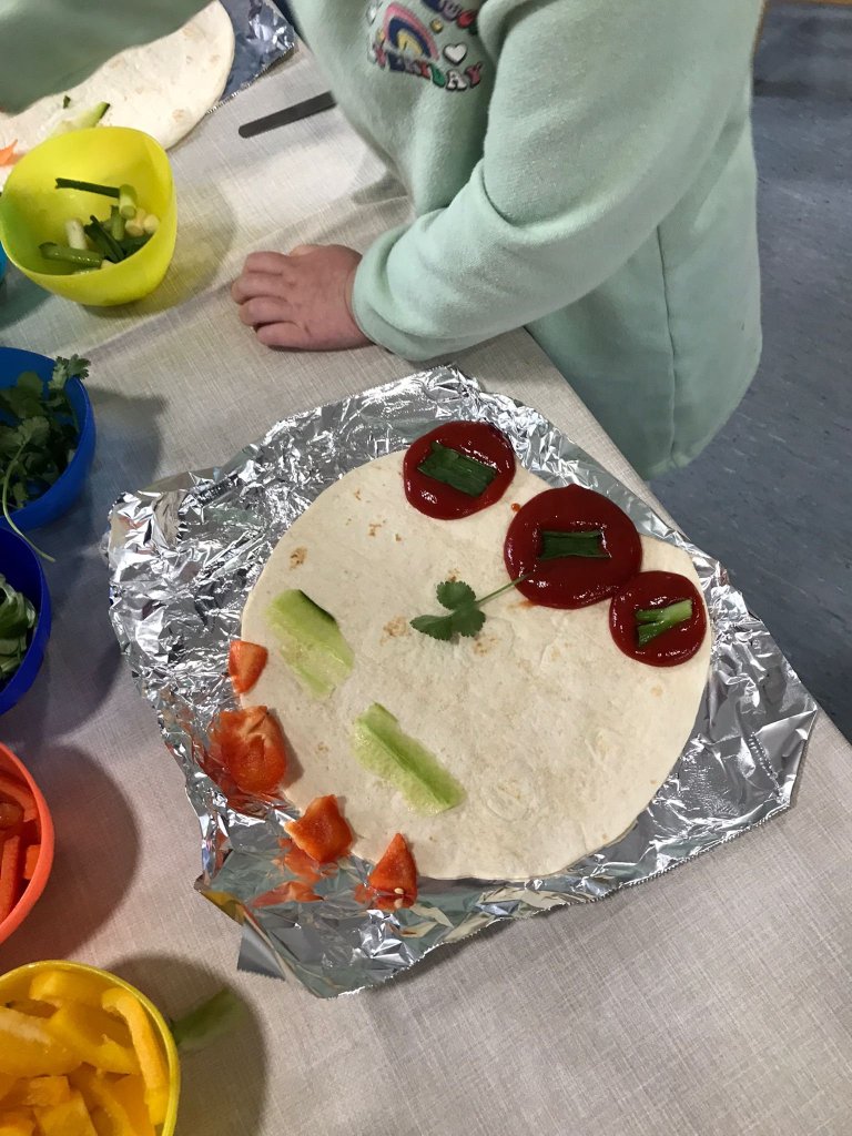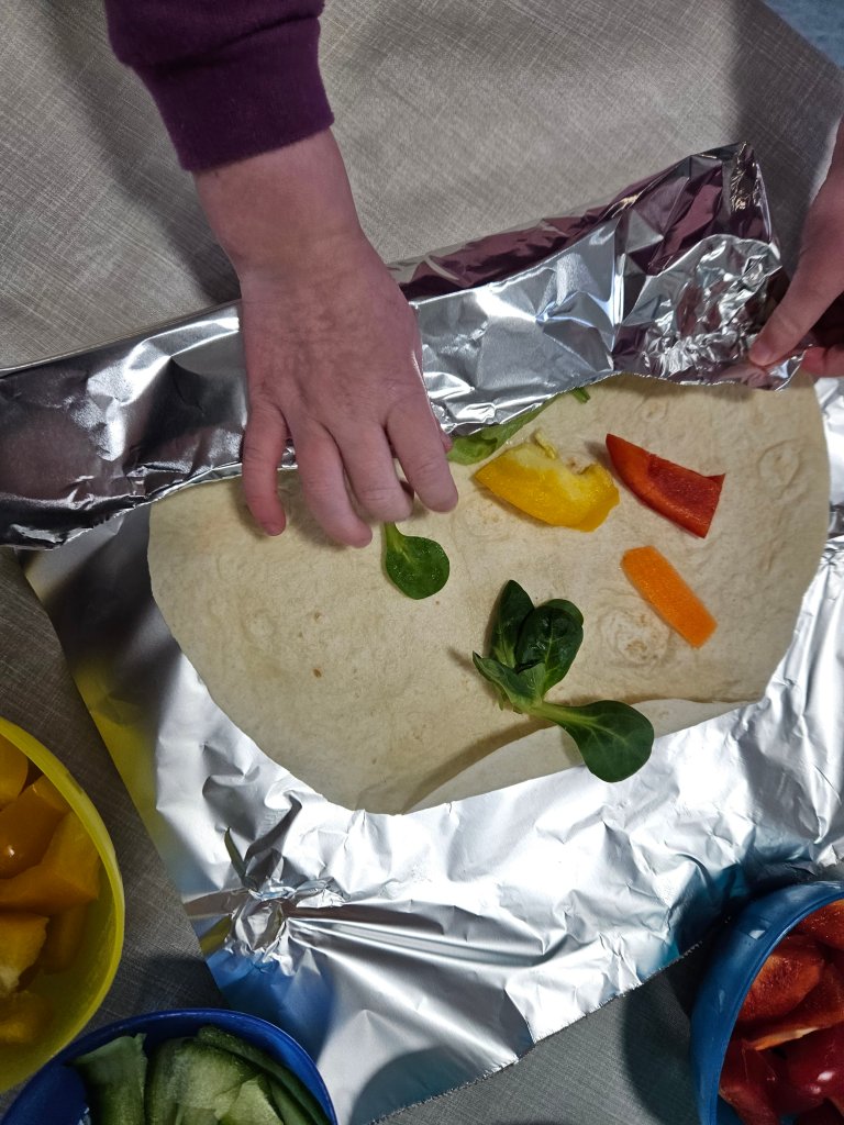 The children had a super time making their wraps. Some of the children helped cut up the vegetables. They were very good at squeezing the sauce out of the bottles. Some of them were very creative making faces out of tge vegetables before rolling them up and wrapping in foil.