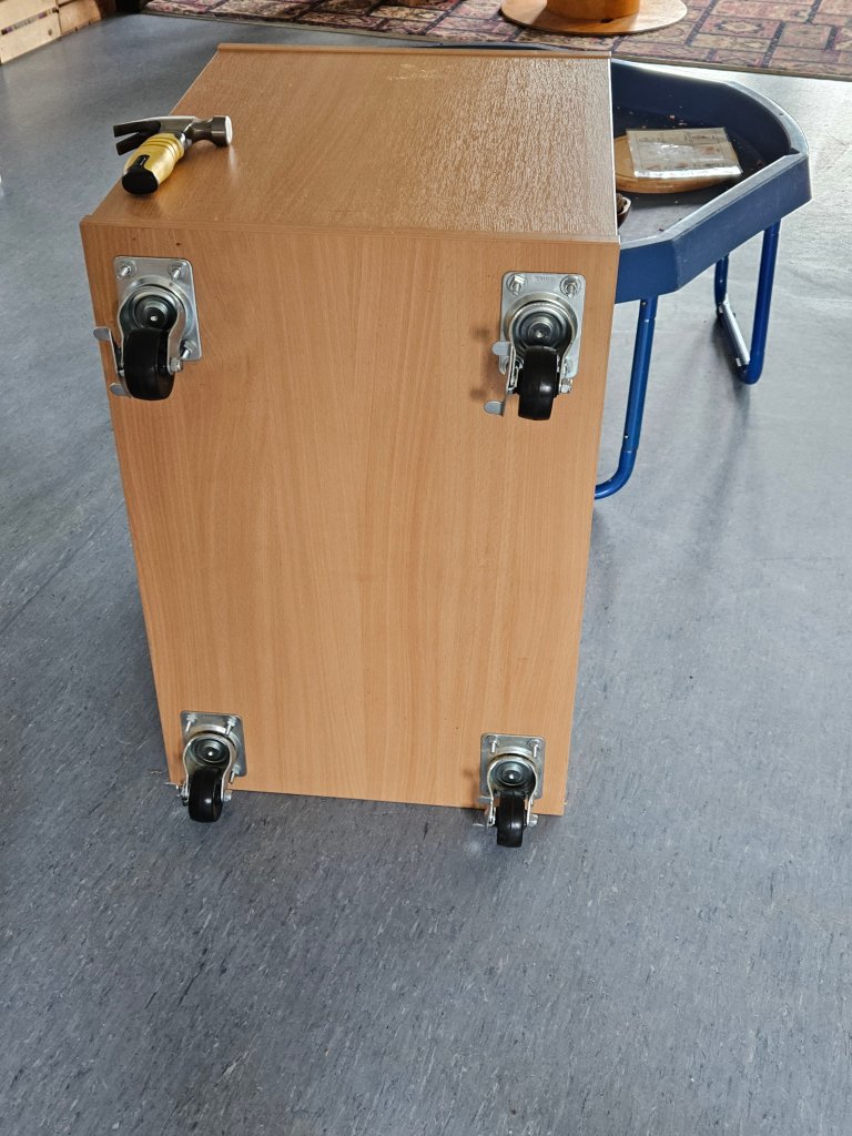 Our wheels on our wooden units have fallen apart so today, Tim and I have spent time replacing 16 wheels on 4 of our units. These are used for our children’s drawers where they place their artwork and bits ready to take home. They velcro their names to the drawer front so reinforcing name recognition.