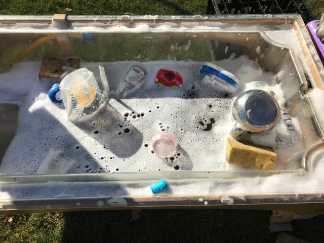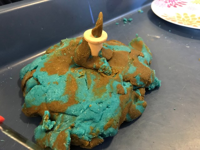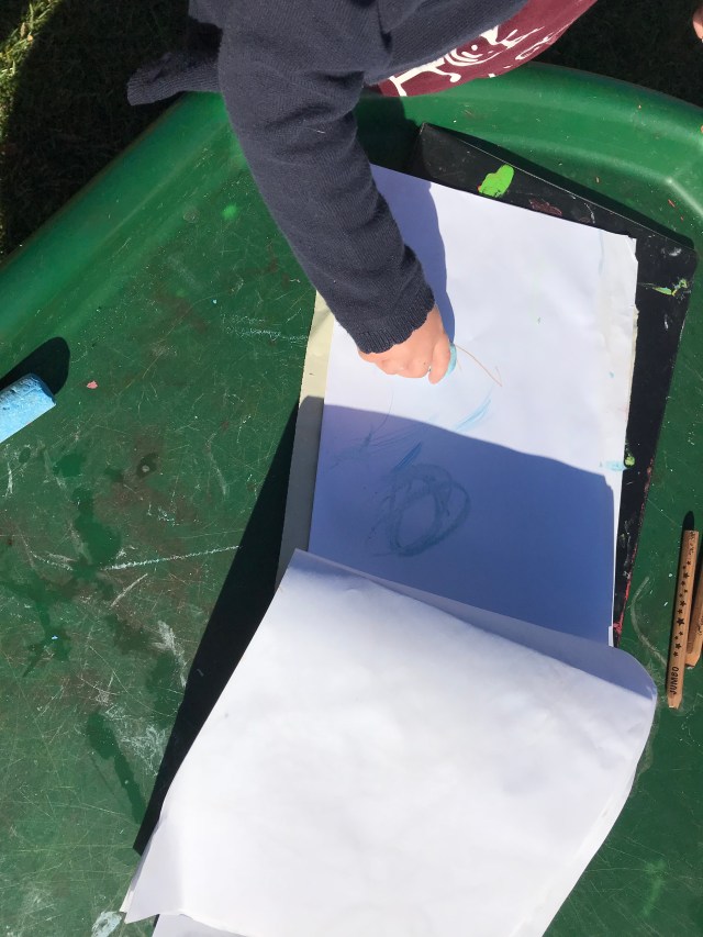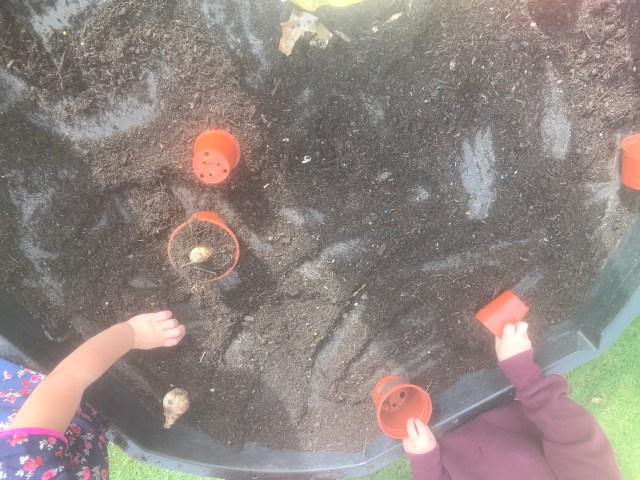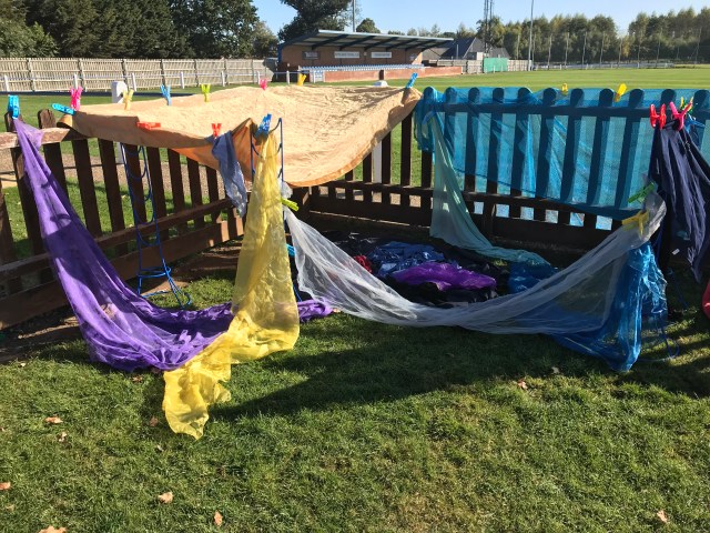 One little 2’s idea of a den. She spent ages choosing the material and pegging it to the stands. As she worked she chatted about what went where. If she needed help she asked the adult to hold the material whilst she pegged it.