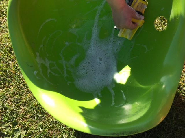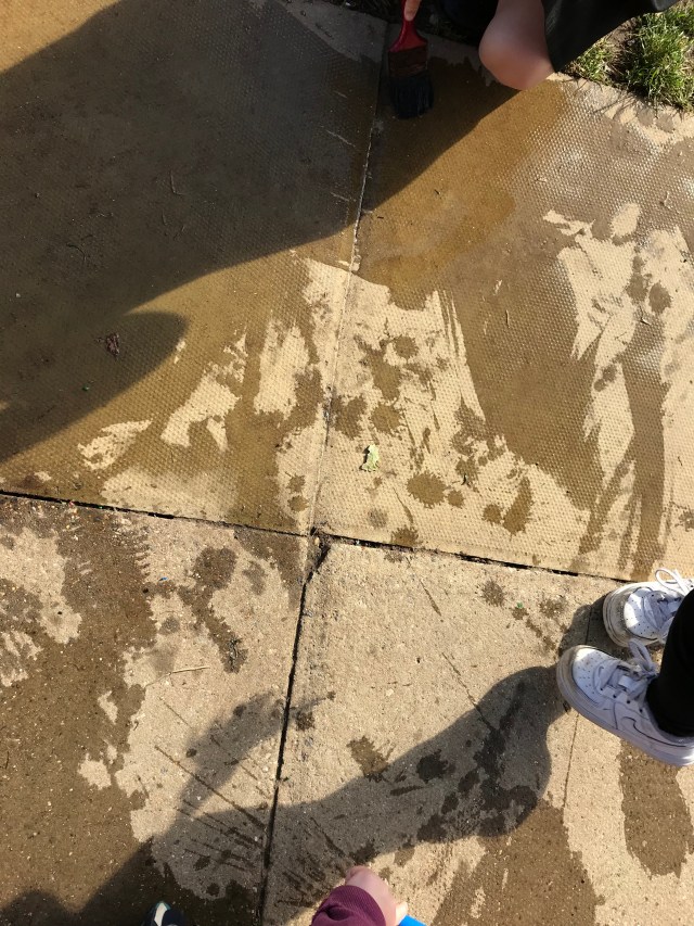 Using the water to make footprints whilst her friends painted the path with water. Lots of talk about how many, the size of the print and when others joined including adults, how much bigger or smaller they were.