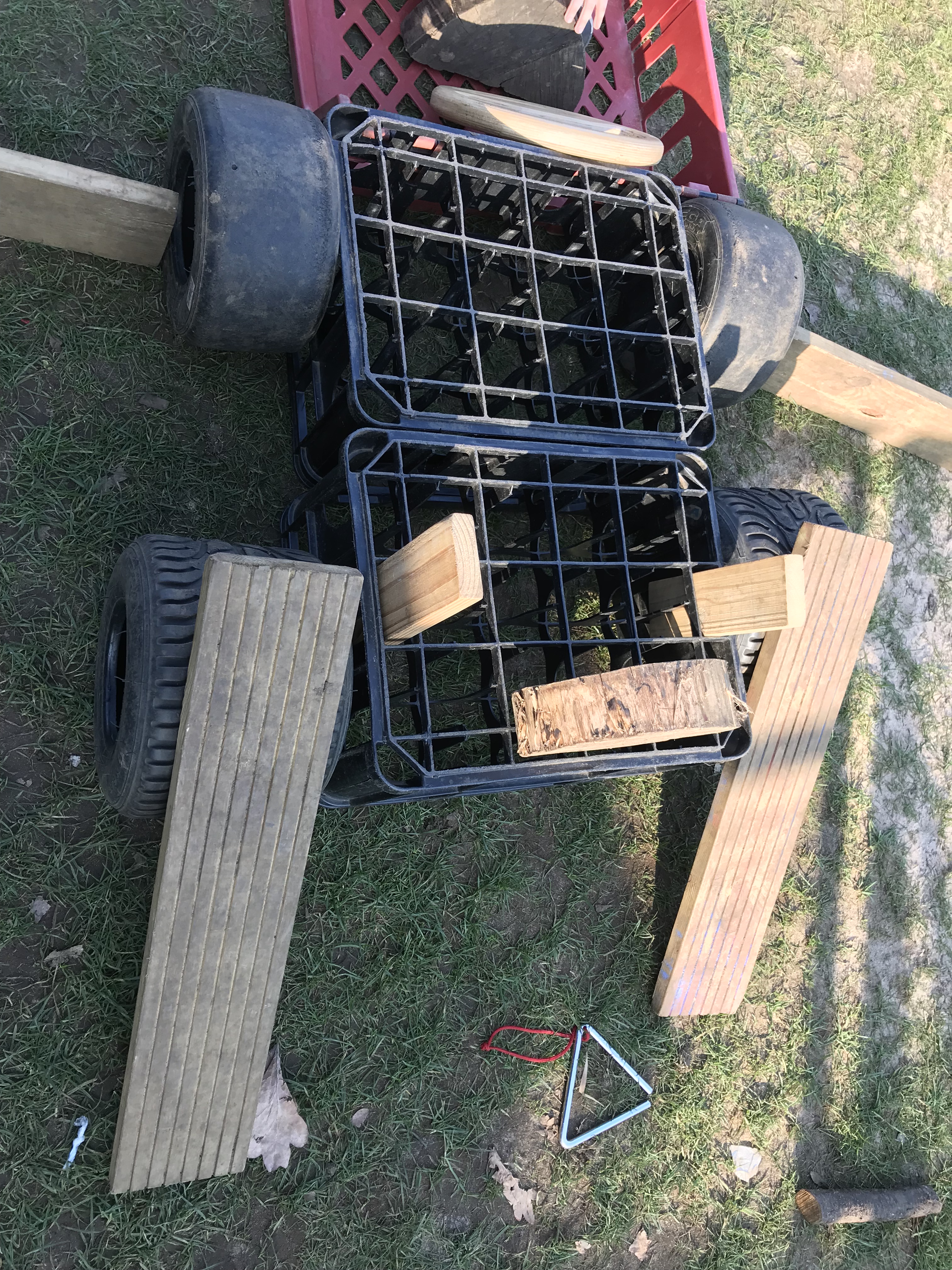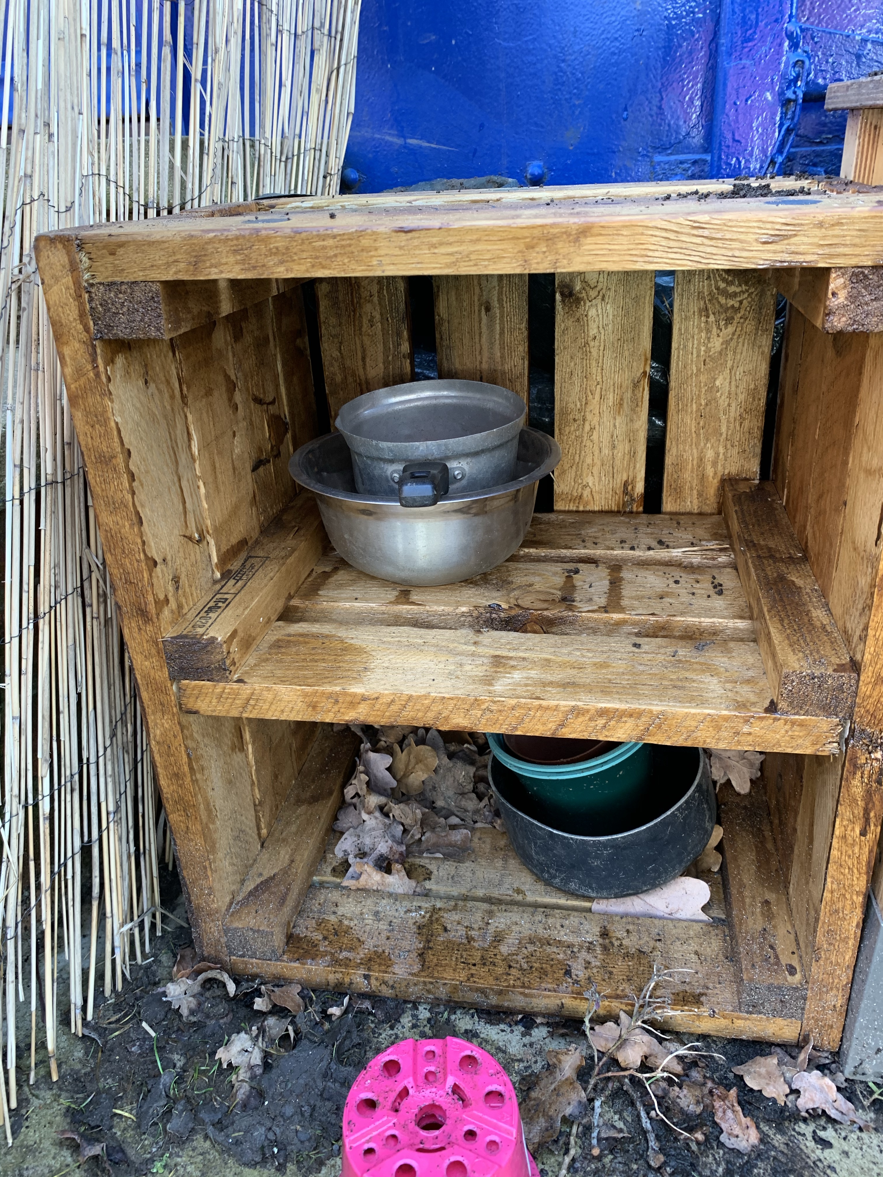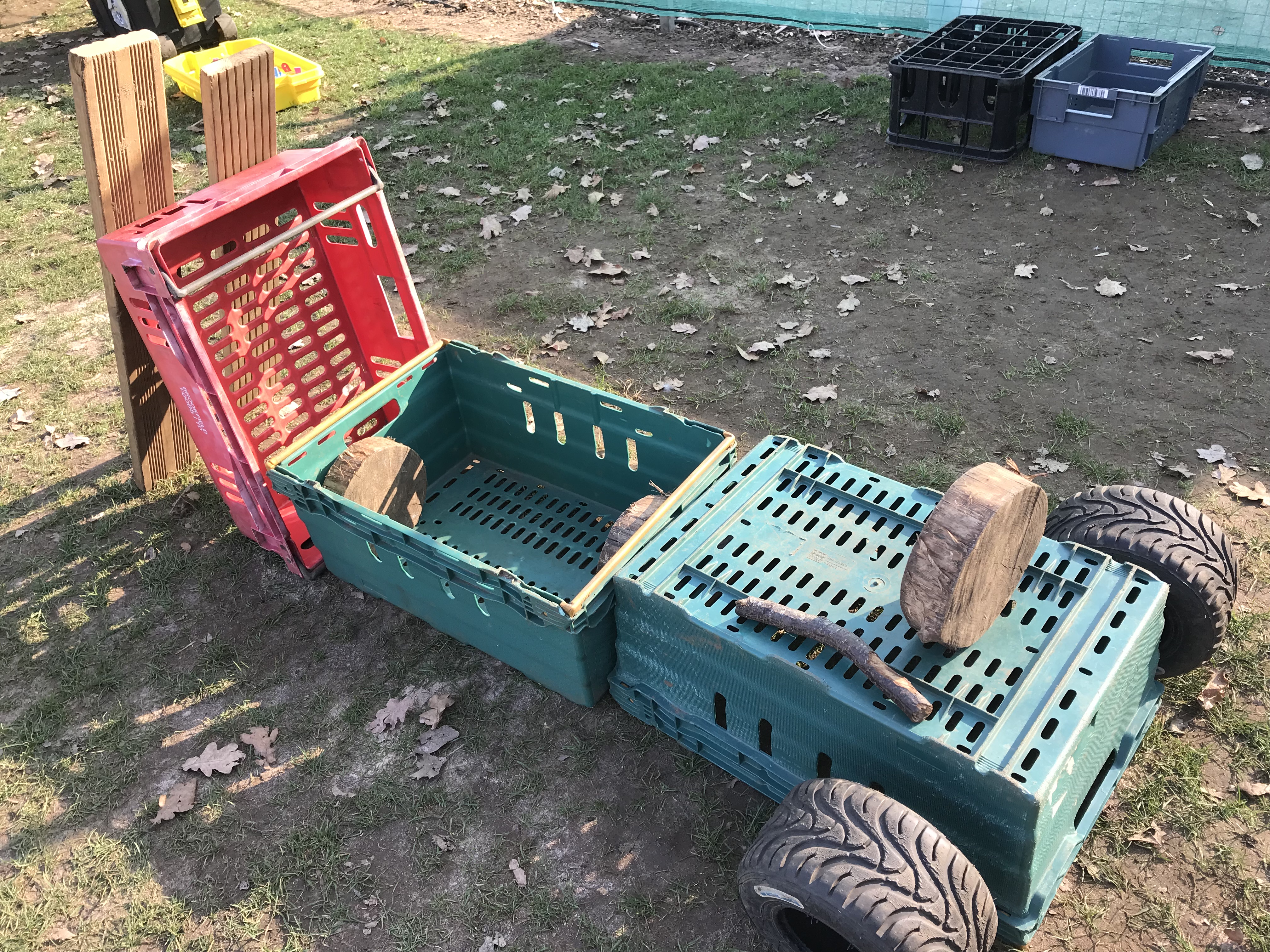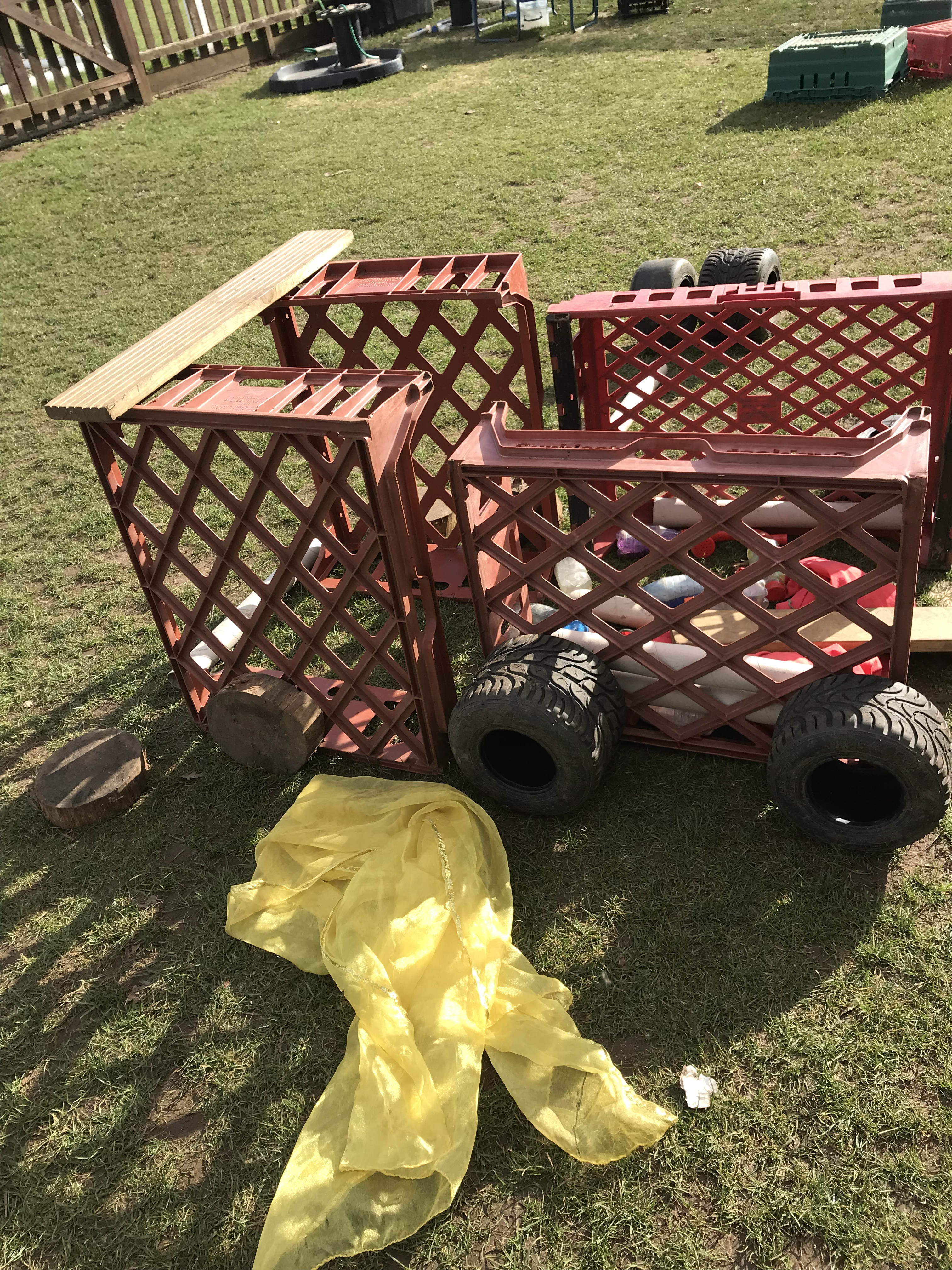 Our favourite games to make vehicles out of the crates in the garden. This time it was a camper van which was loaded up with resources that you’d need to go on a trip.