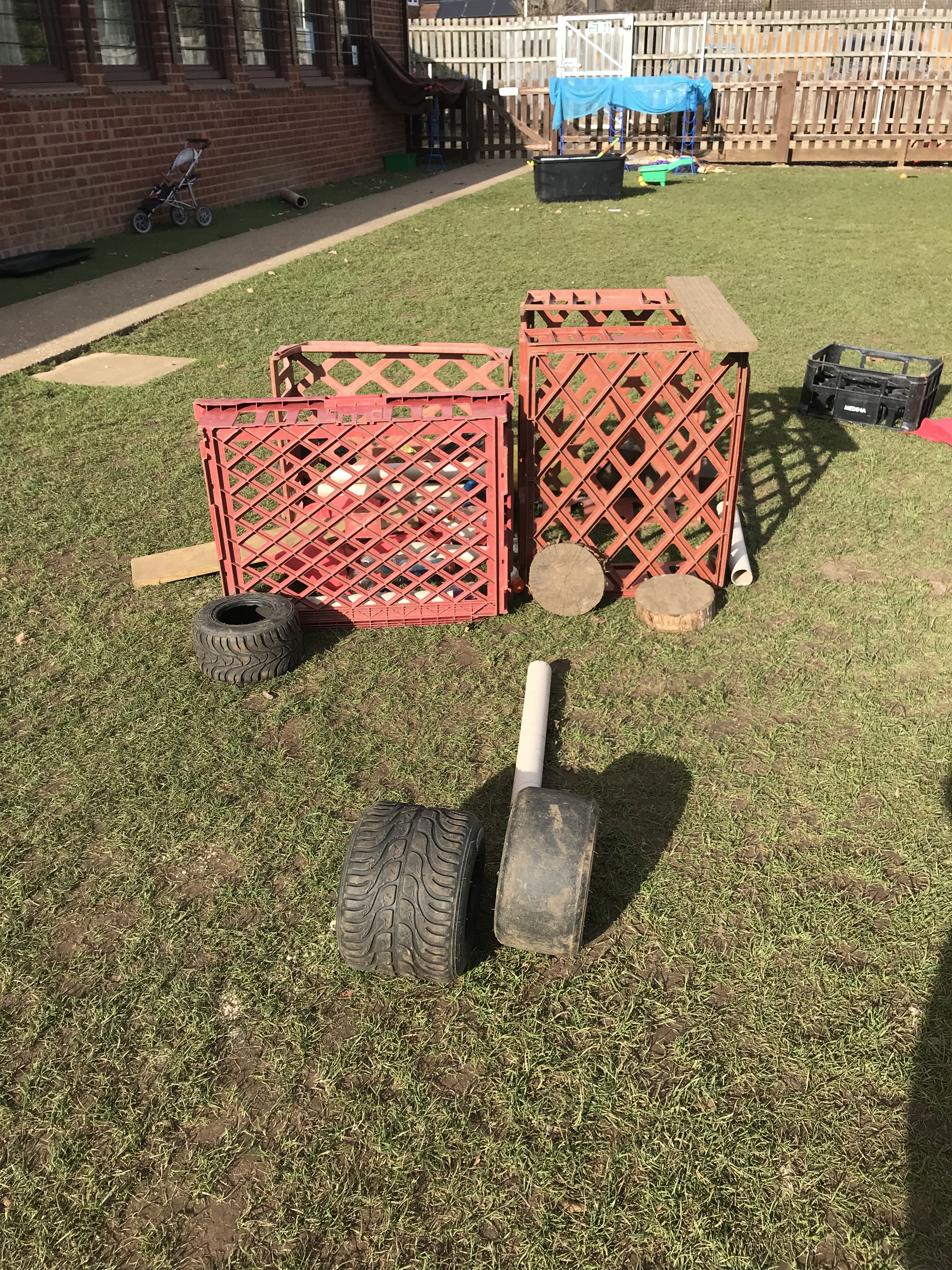 The wheels on our wooden car. We had lots of cars around the room, some with passengers and some 2 seaters. We had lots of discussion and teamwork amongst the children.