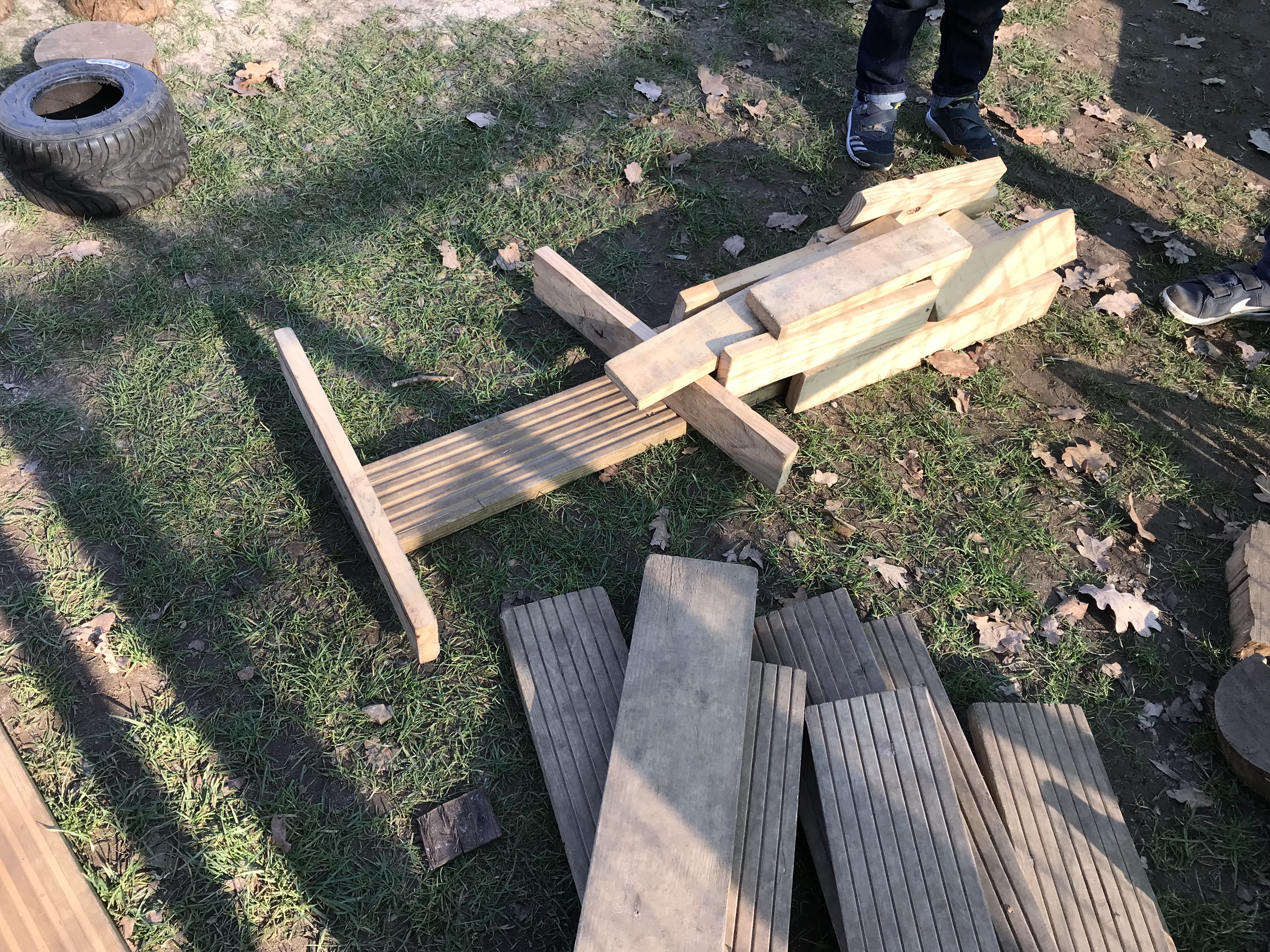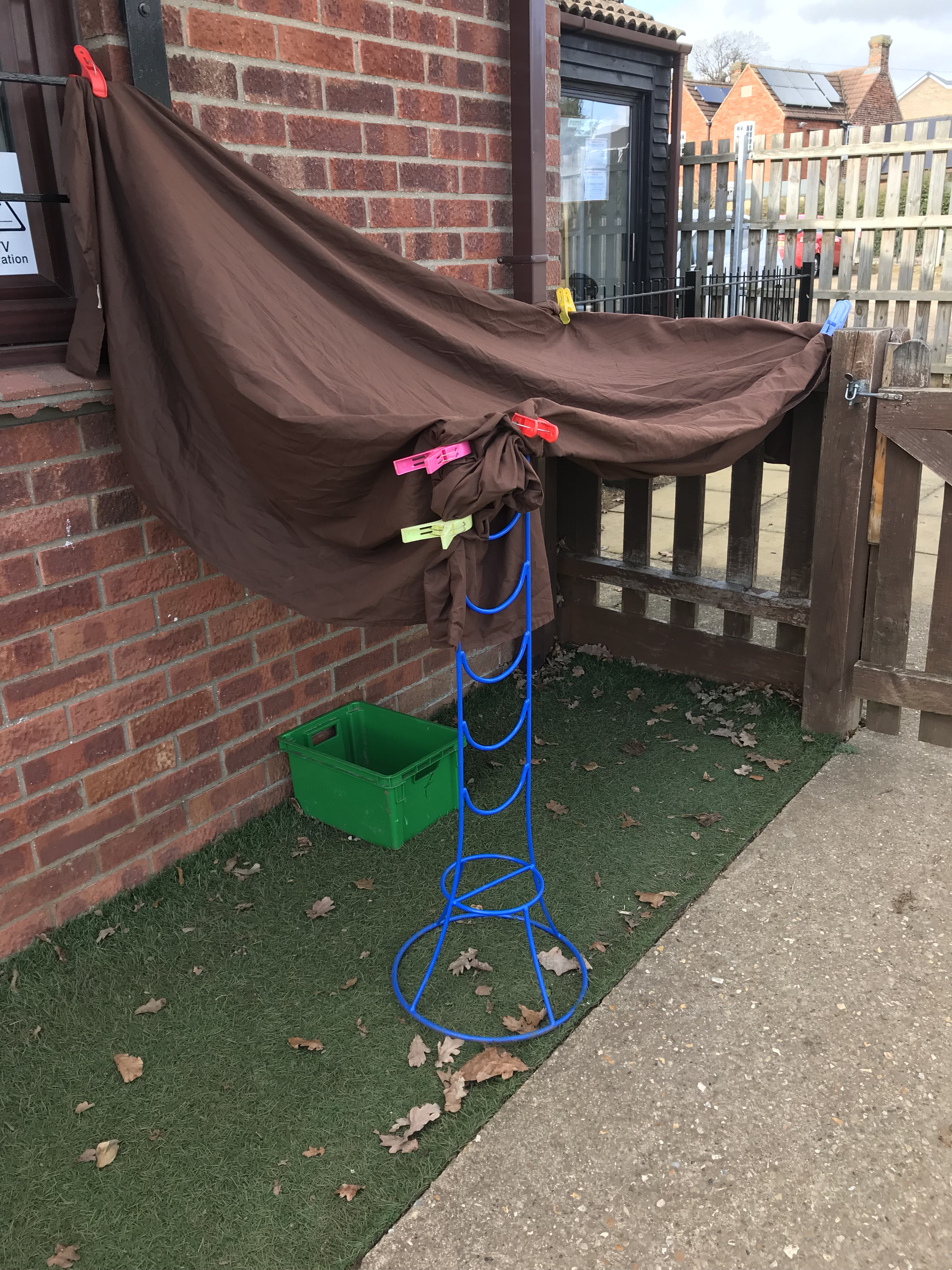 Den building. The children are getting quite adept at using the fence to help support the roof of their dens. The giant pegs are great for developing those finger and hand muscles for writing when they are older.