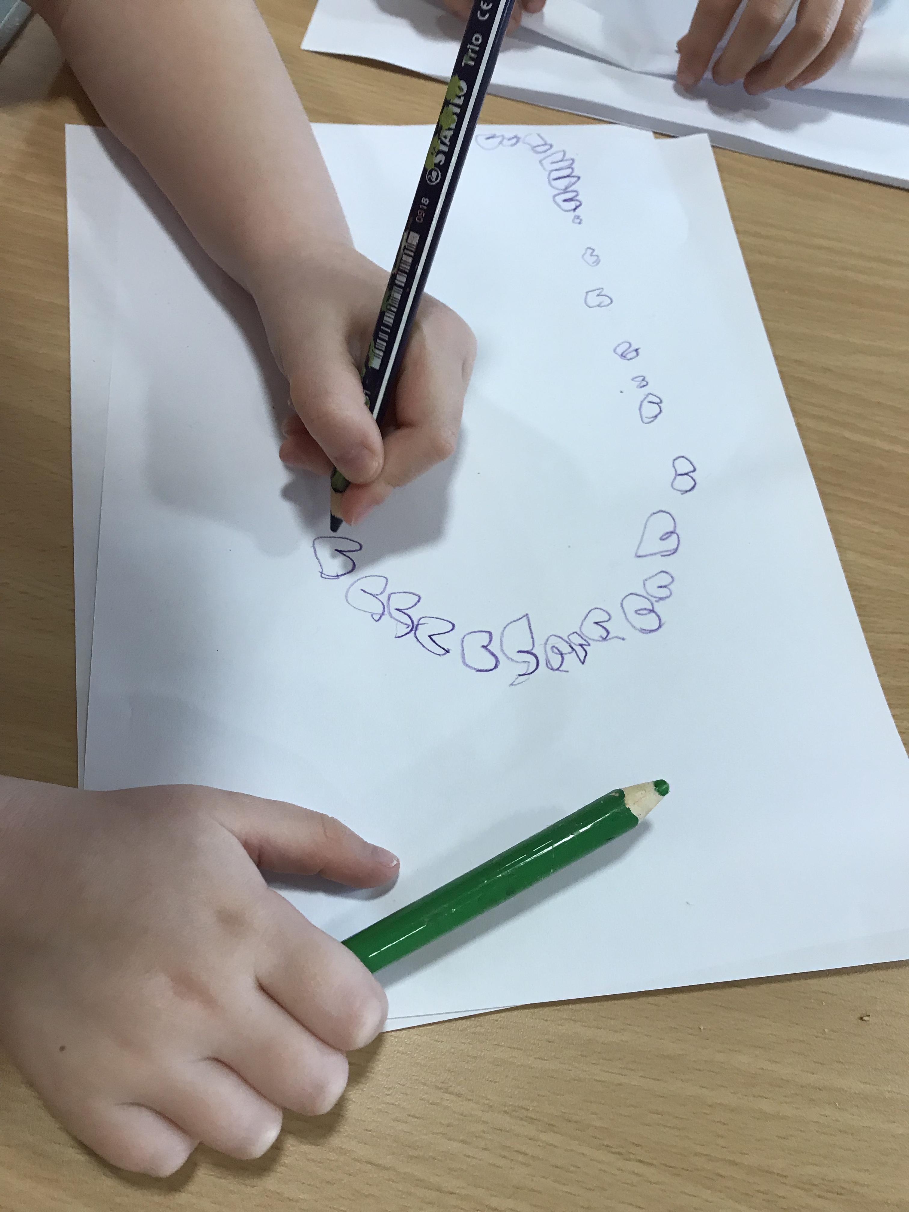 Circles and lines. Talking about our names, the sounds our letters make and singing some jolly phonic songs.