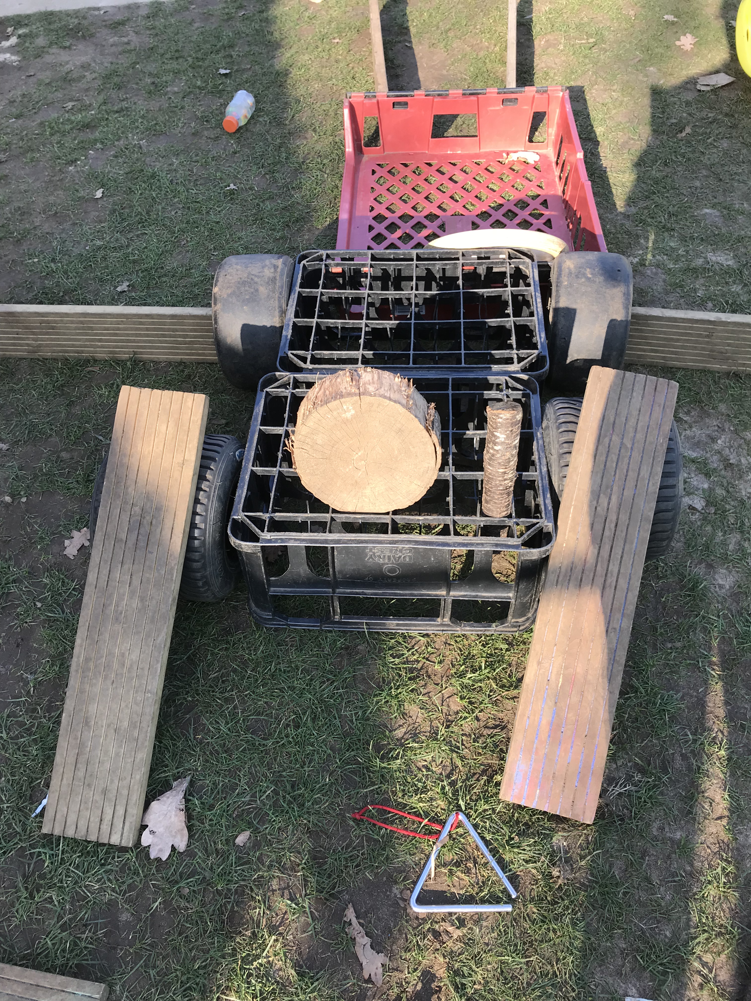 More car building, this time the bits of wood on the wheels were the ‘brakes, to help it stop’. The green car has got a ‘hand brake’ too.
