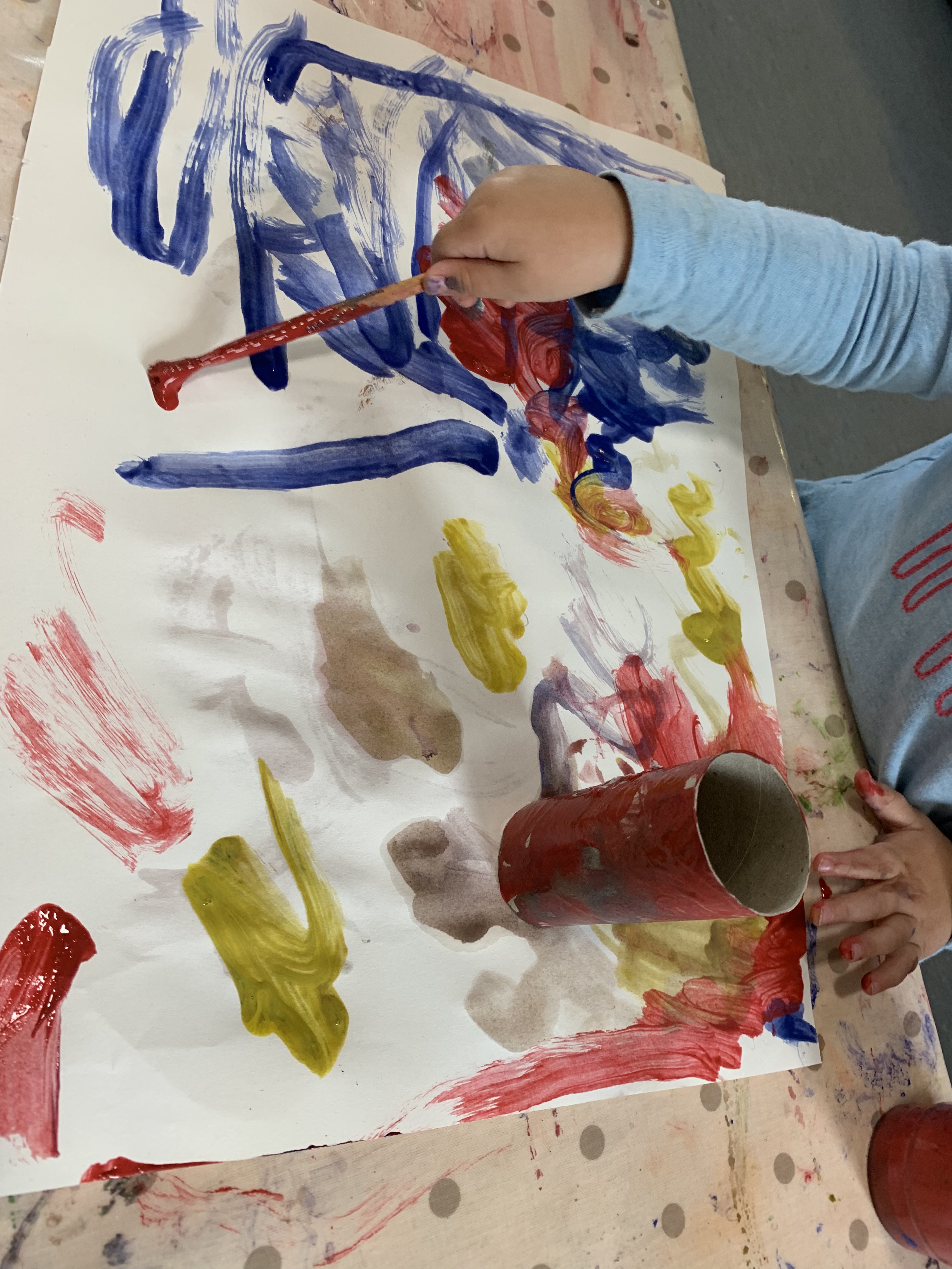 Painting, we have been encouraging the children to wash out their paint brush after using it in one paint. this way they get to learn about waiting and taking turns and that water washes out the paint.