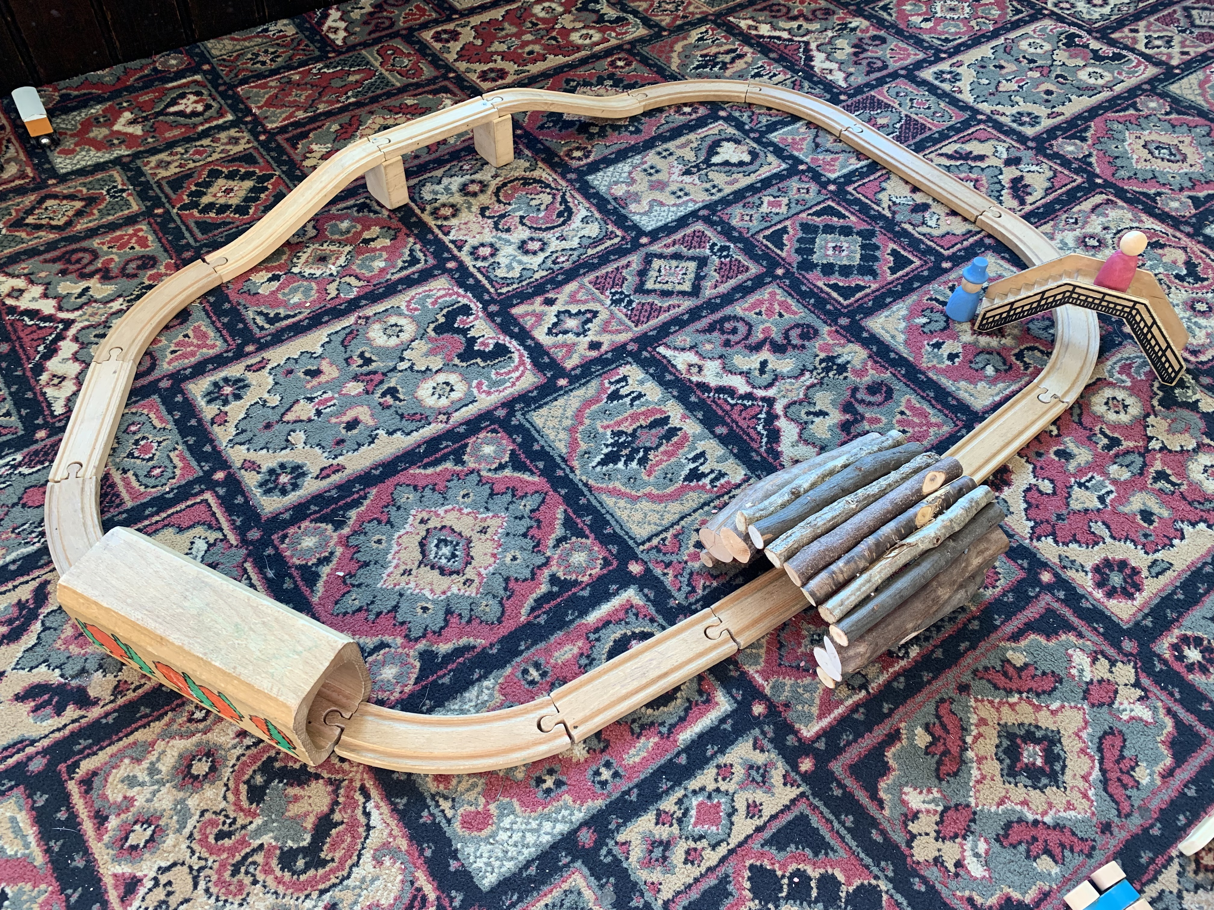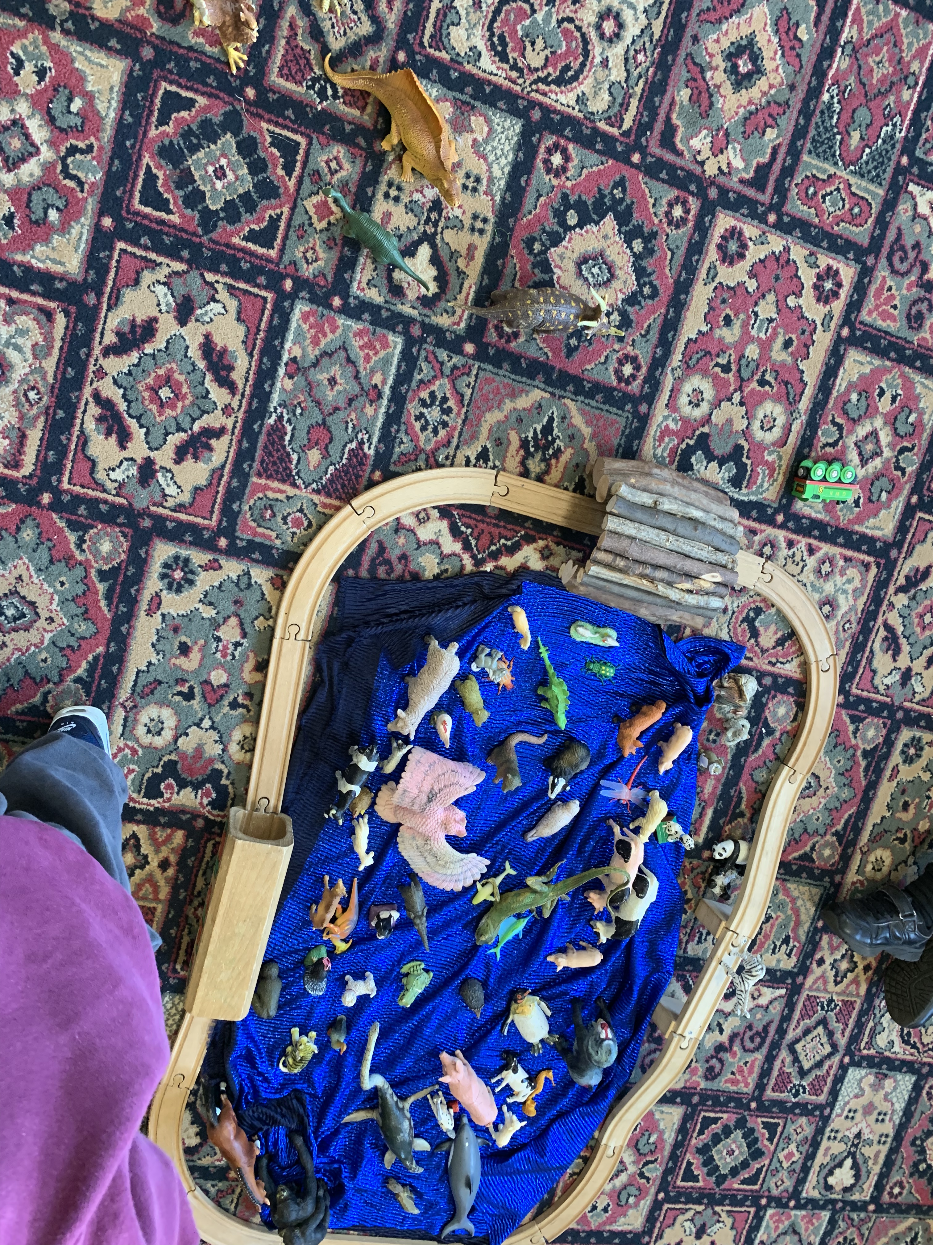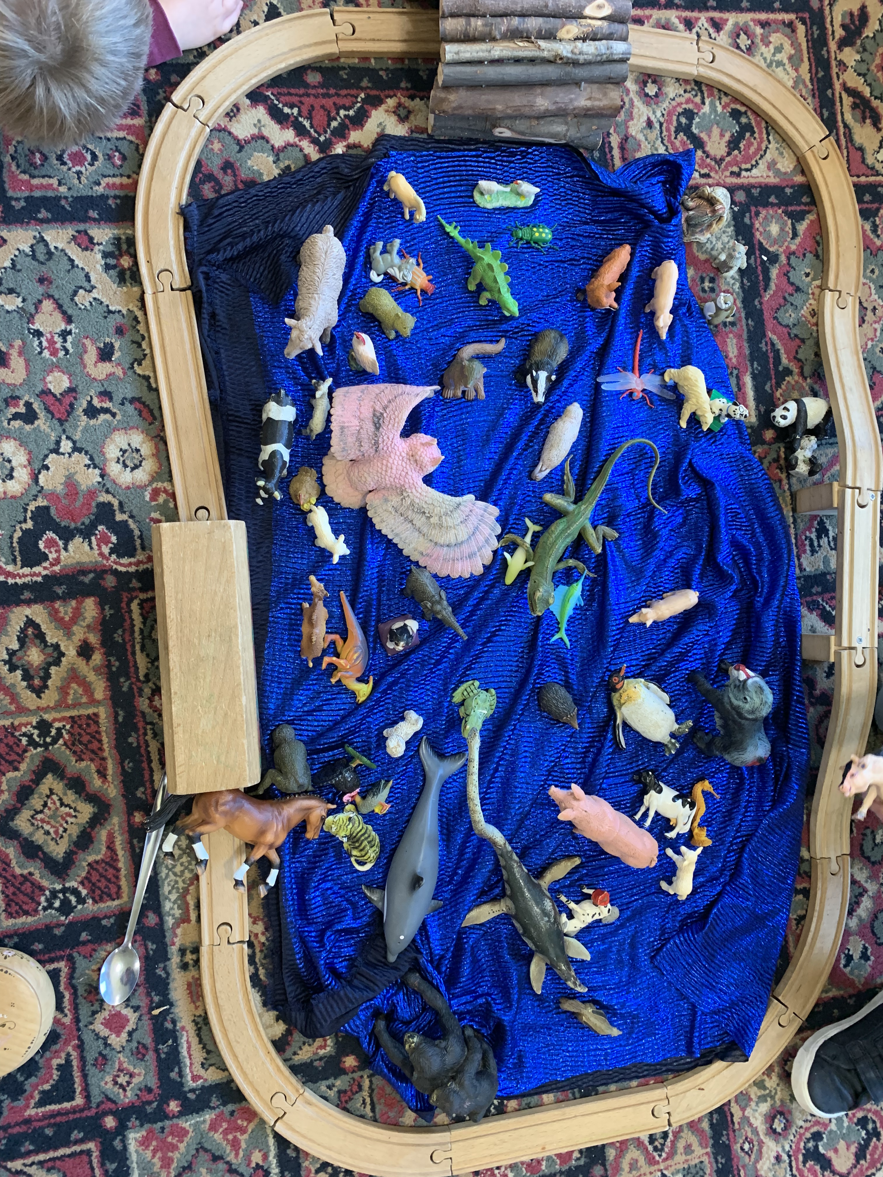 A sea world With lots of different animals having a swim, in the middle of the train track. The child that designed this knew all the animals and named them as he placed them in their specific places.